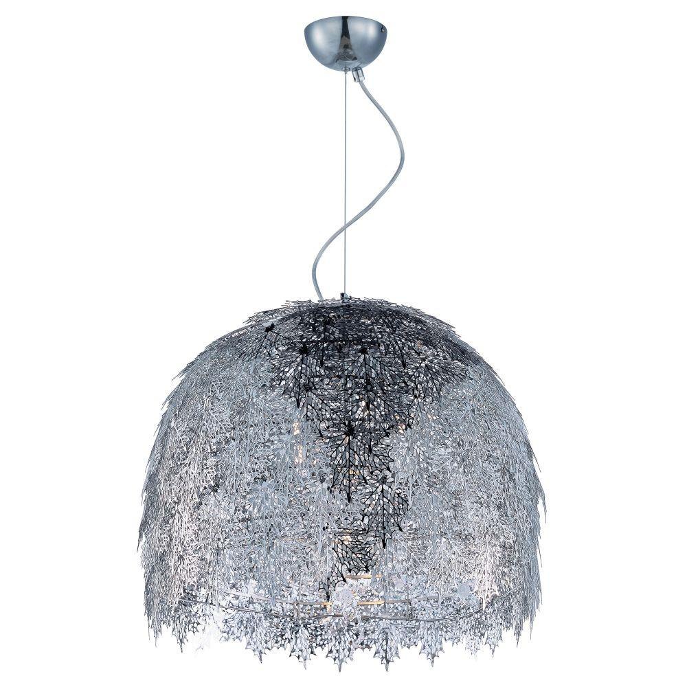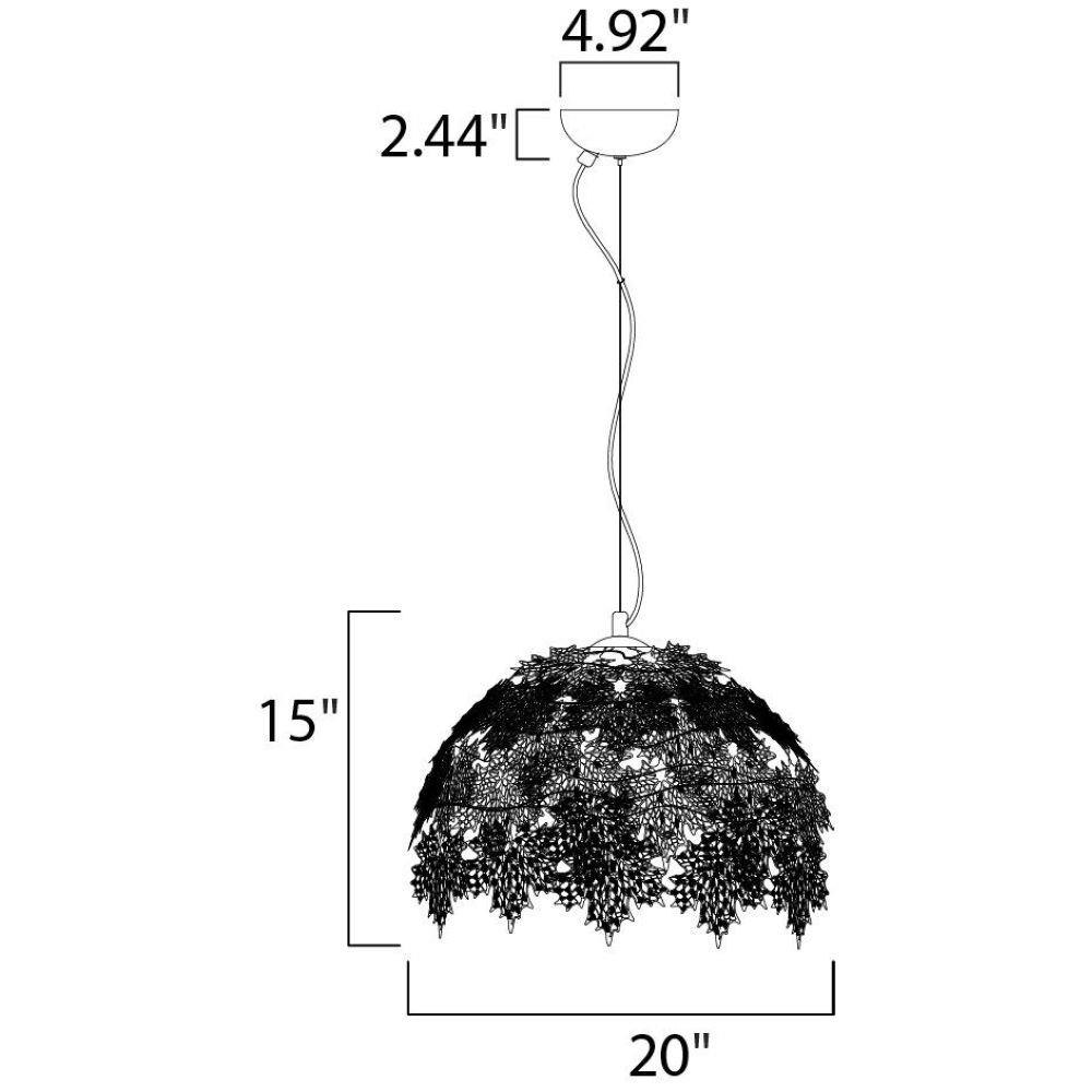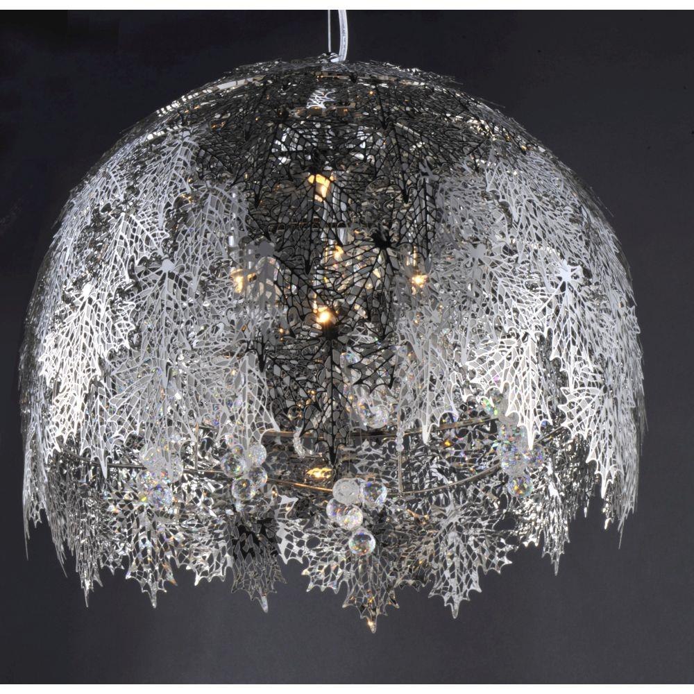 Intricately detailed leaves of Polished Chrome stainless steel are formed by a two-step process. This creates a two layer texture to each leaf for a multi-dimensional appearance. Clusters of crystal grapes and vines adorn the inside and shimmer through the light of the Xenon lamps.