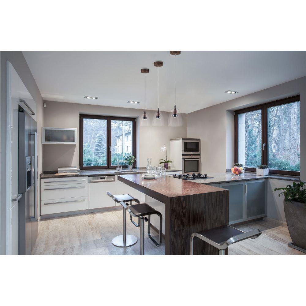 Clear glass domes are suspended from a machined aluminum font finished in your choice of two tone Silver with a Polished Chrome accent or Black with a brushed Coffee finish. Housed inside the machined font is a high power LED module which illuminates without glare.