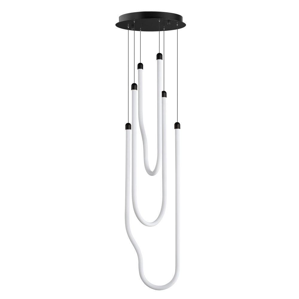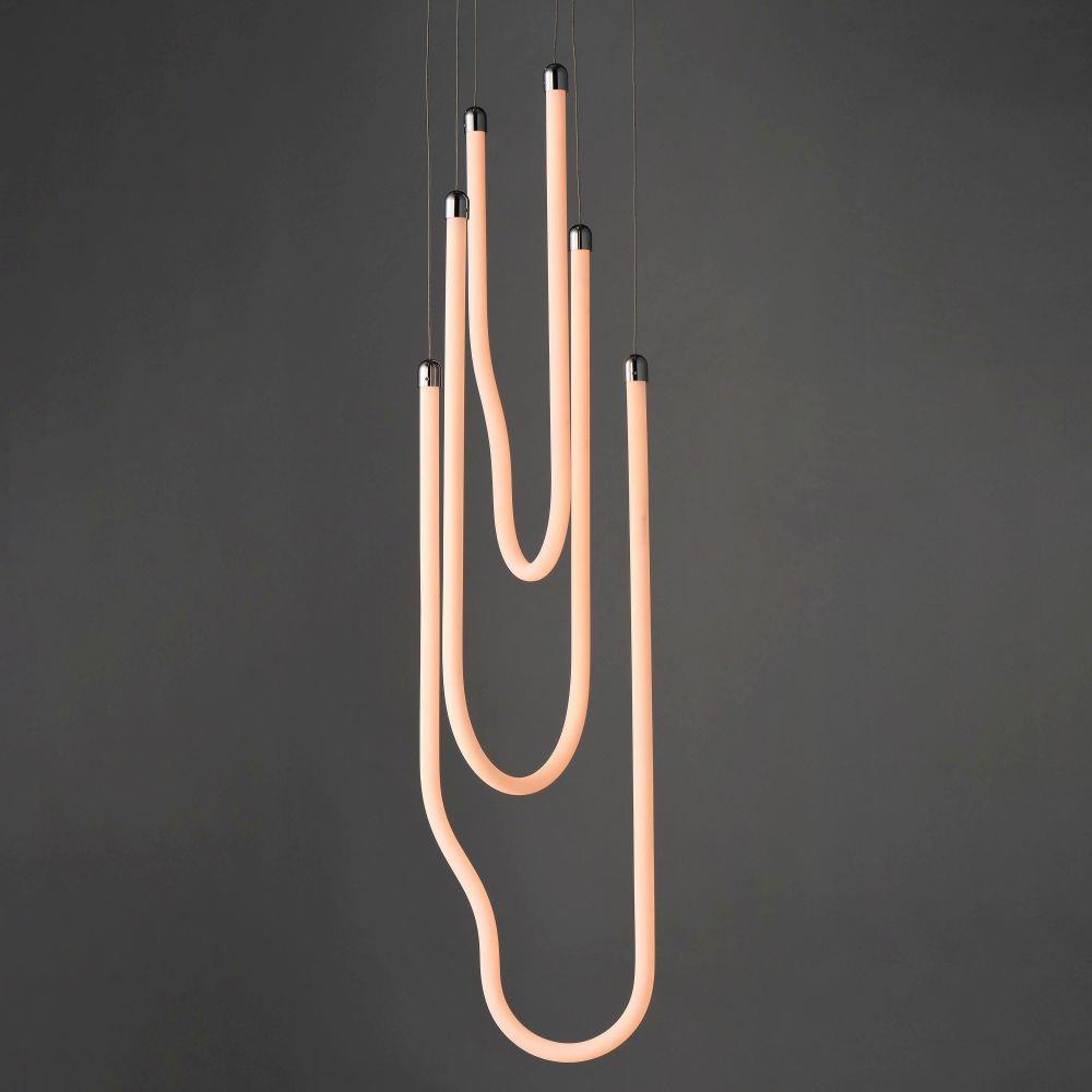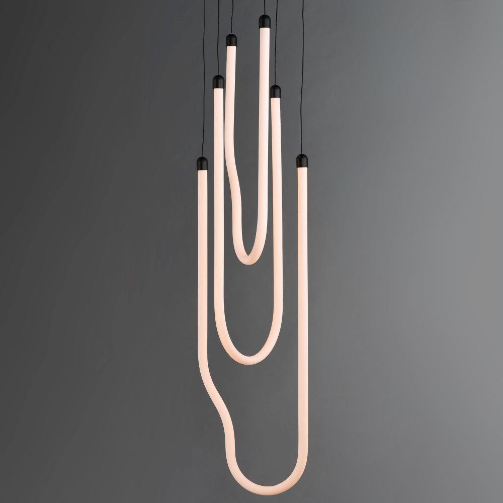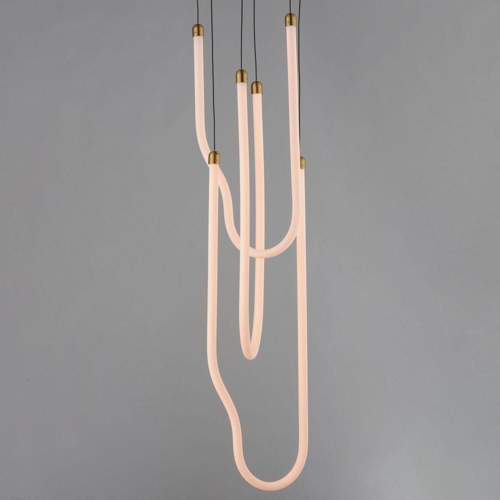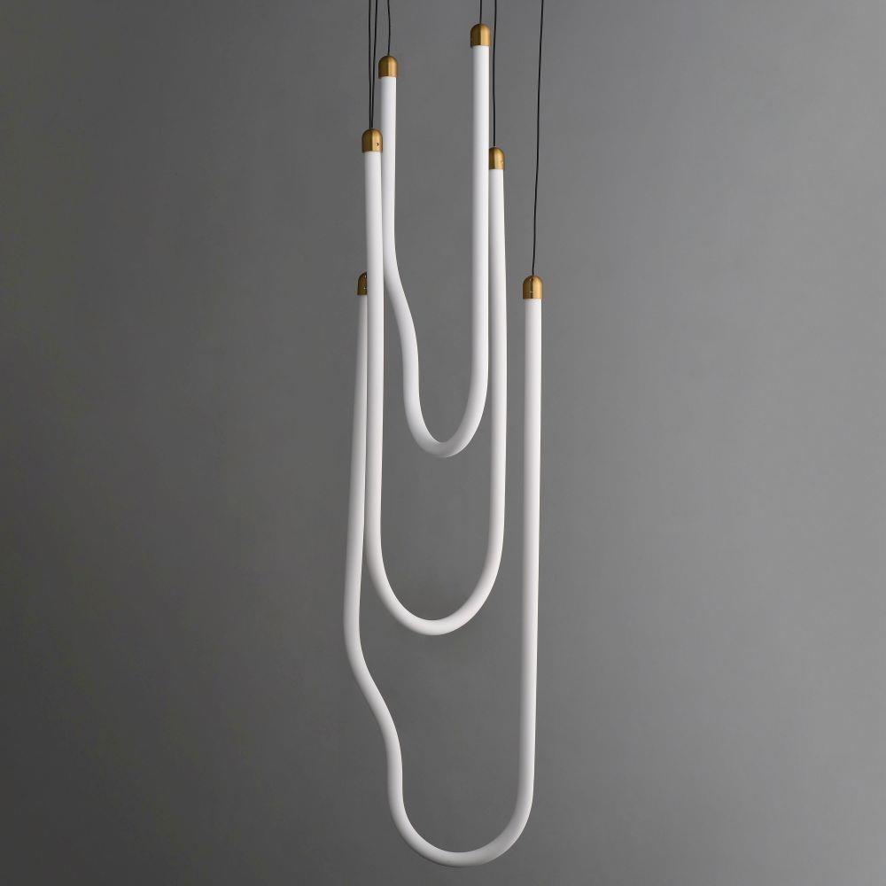 Sweeping matte white acrylic tubes encase an omnidirectional LED light source, arranged in abstract configurations inspired by solar flares. Minimal in composition yet dramatic in form, the Soleil collection offers a striking lighting solution. Available in a range of sizes, including fixed flush mount and field-adjustable pendant configurations, Soleil is offered in Polished Chrome, Matte Black, and Natural Aged Brass, making it a perfect complement to a variety of interior color schemes.
