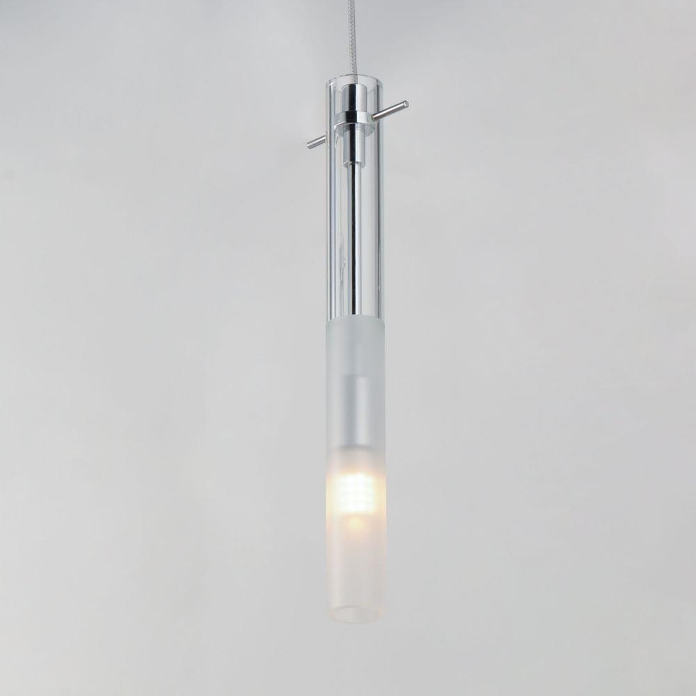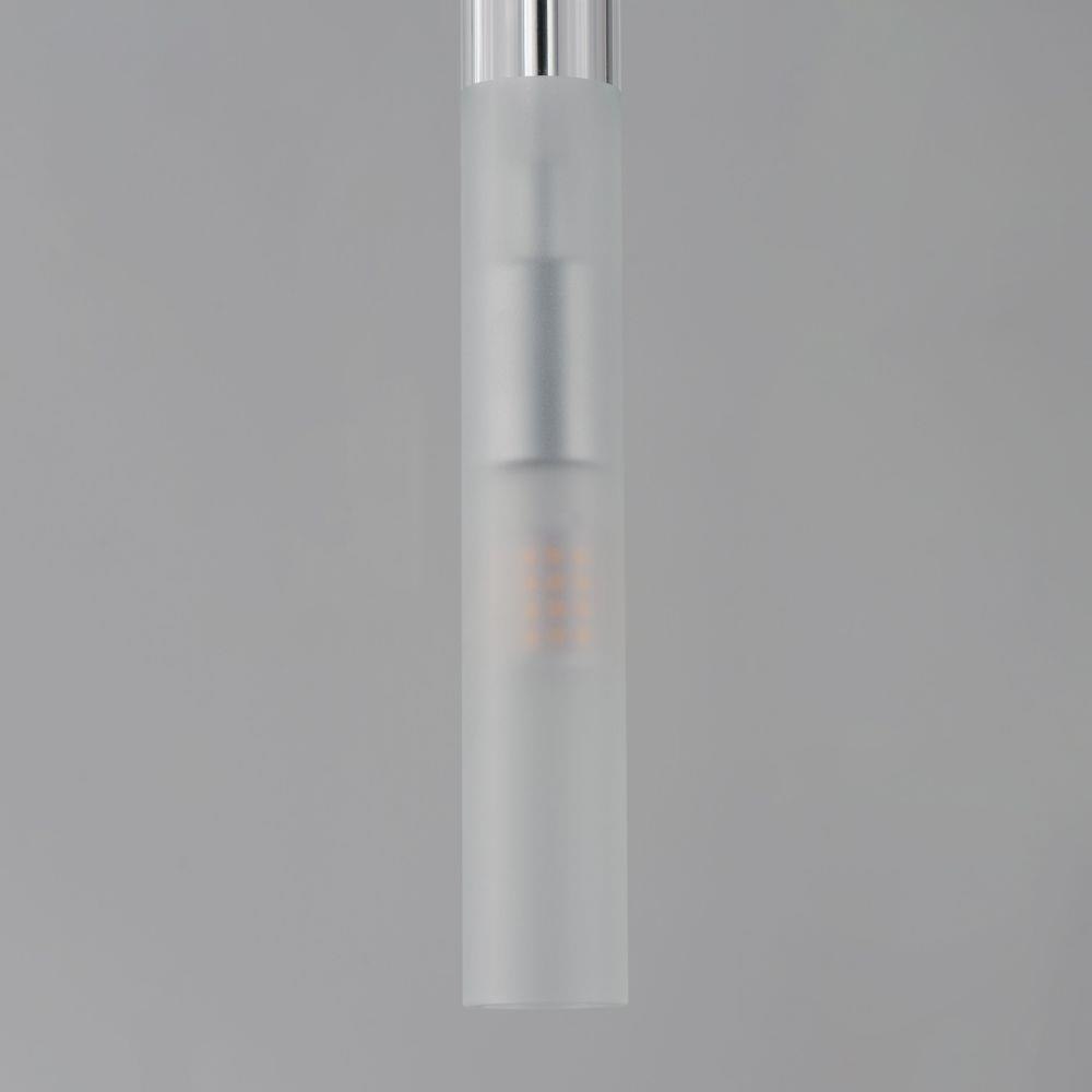 Slender Clear glass tubes sheath a Polished Chrome rod that supports small LED lamps. The glass is etched at a dividing line in the glass to softly diffuse the light. Available in two lengths of glass tube, the pendants are also available in multiple configurations that create a modern candle-like cluster. The surface mounted option supports the glass on a structure that allows it to hang freely for dual purpose as a ceiling flush mount or a hanging glass shade when mounted to a wall. JA8 Listed LED G9 lamps are provided for efficient lighting and reduced energy consumption.