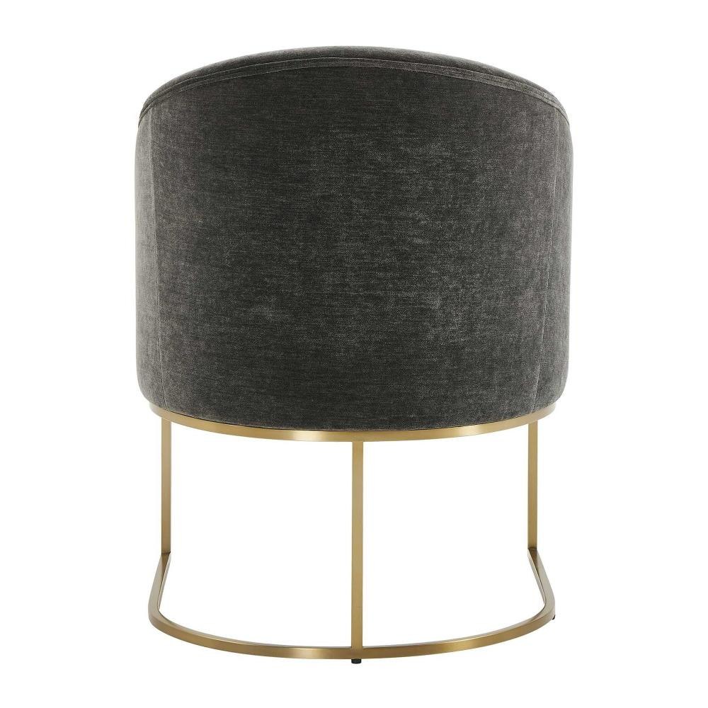 The Hanni Dining Chair Features A Sleek, Curved Steel Frame In A Brass Plated Finish And A Barrel Style Seat Upholstered In Charcoal Polyester Velvet.