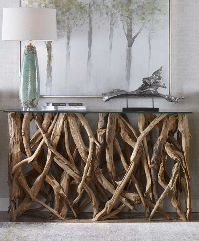 Coastal Mod Farmhouse Lodge RECLAIMED TEAK WOOD Branch GLASS TOP CONSOLE 59"