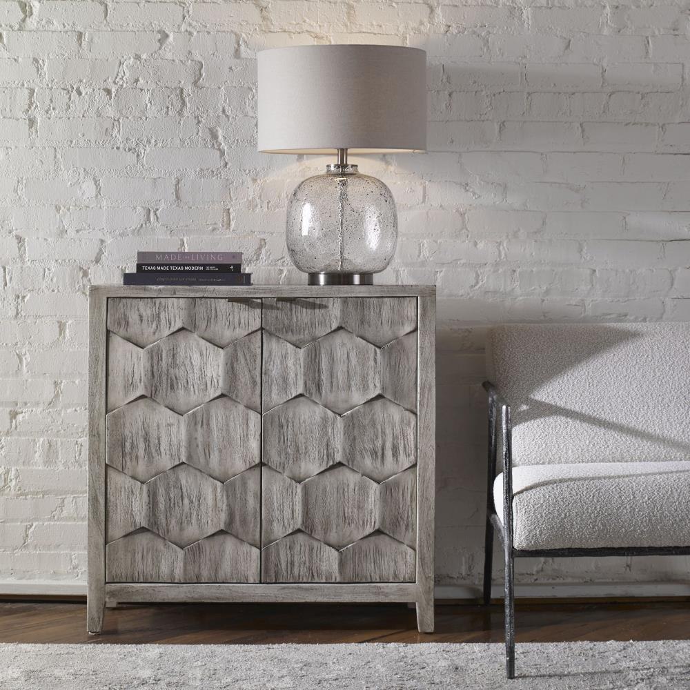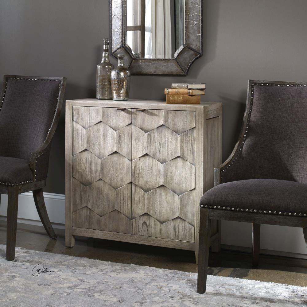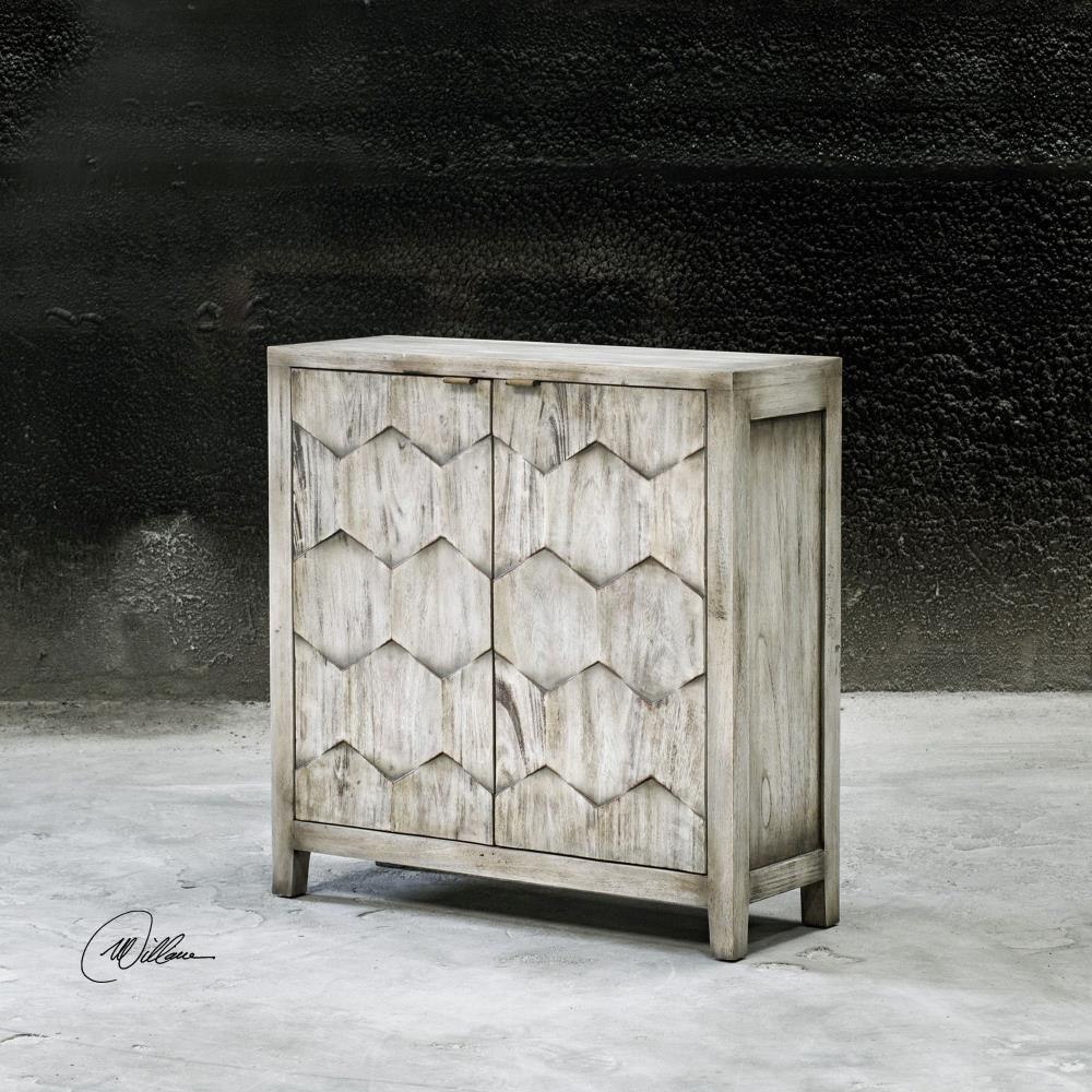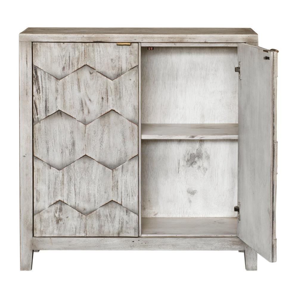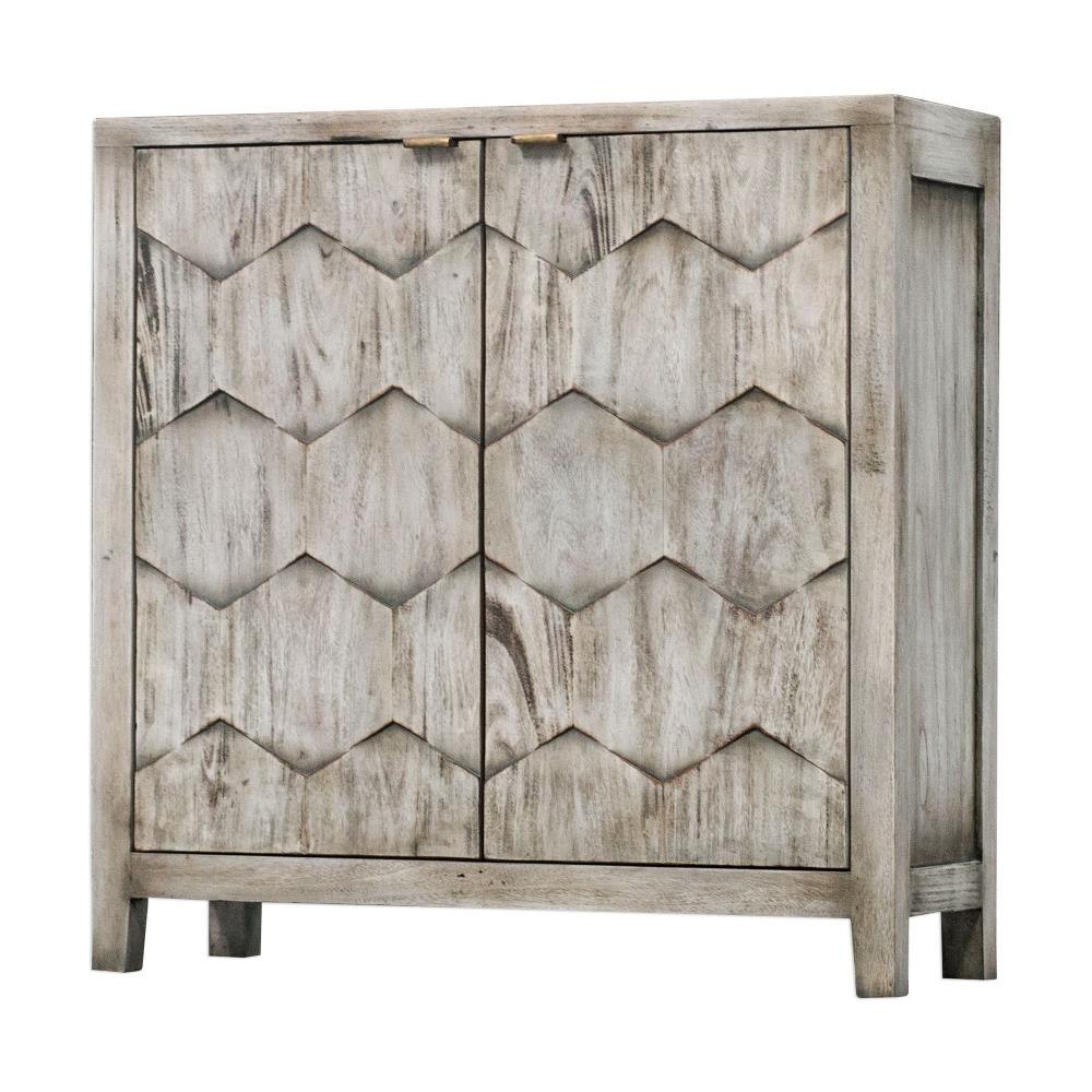 Expert Craftsmanship Is Displayed In The 3-dimensional Honeycomb Striped Doors In Smoked Ivory Finished Mahogany Wood With Antique Bronze Iron Handles. Includes One Adjustable Interior Shelf.