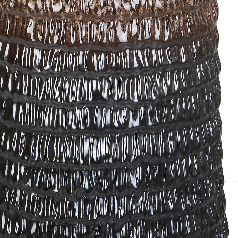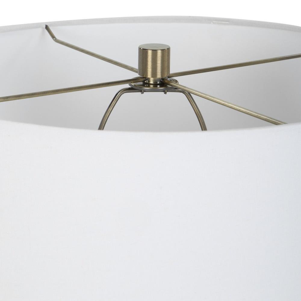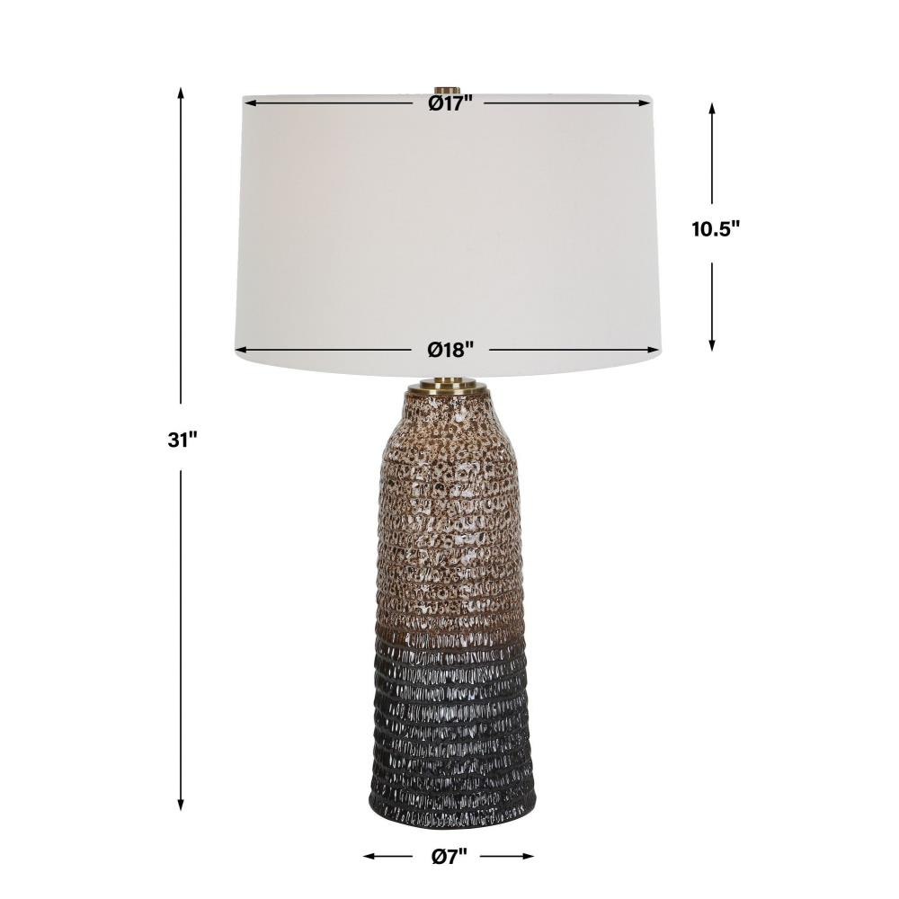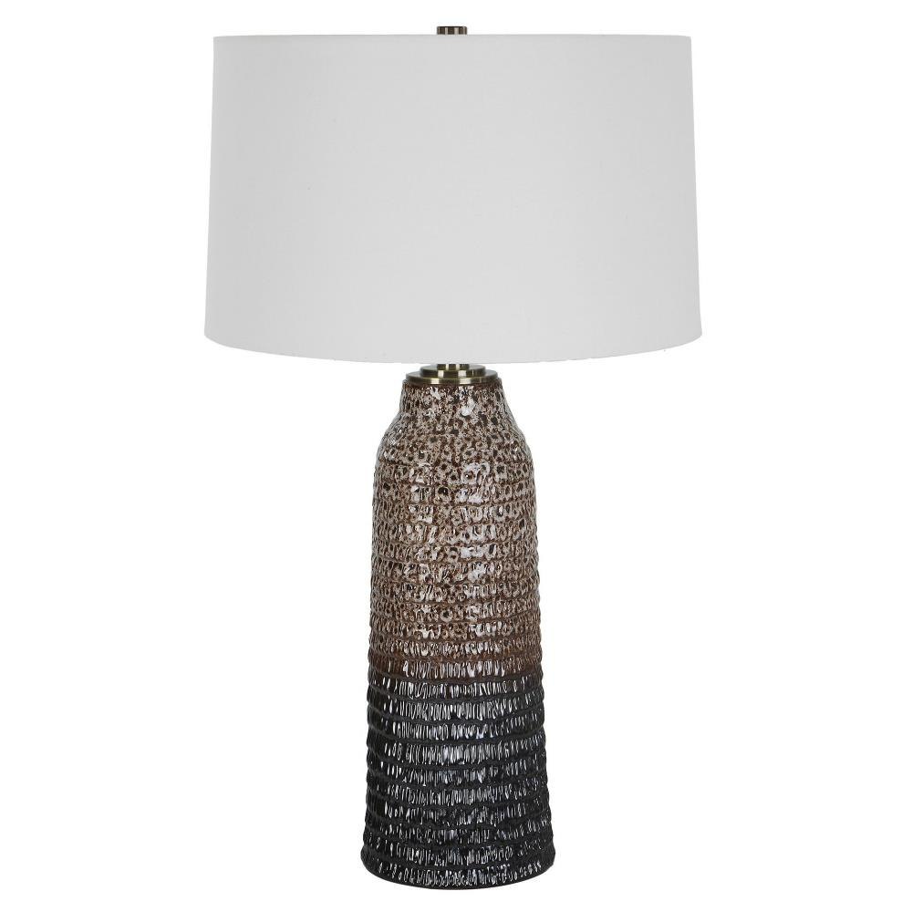 This Table Lamp Displays A Unique, Organic Feel With A Carved Ceramic Base Finished In A Mottled Ombre Effect From Aged Ivory Down To Dark Chocolate, Accented With Plated Brushed Brass Details. Paired With A Tapered Hardback Drum Shade Covered In A Casual White Linen Fabric.