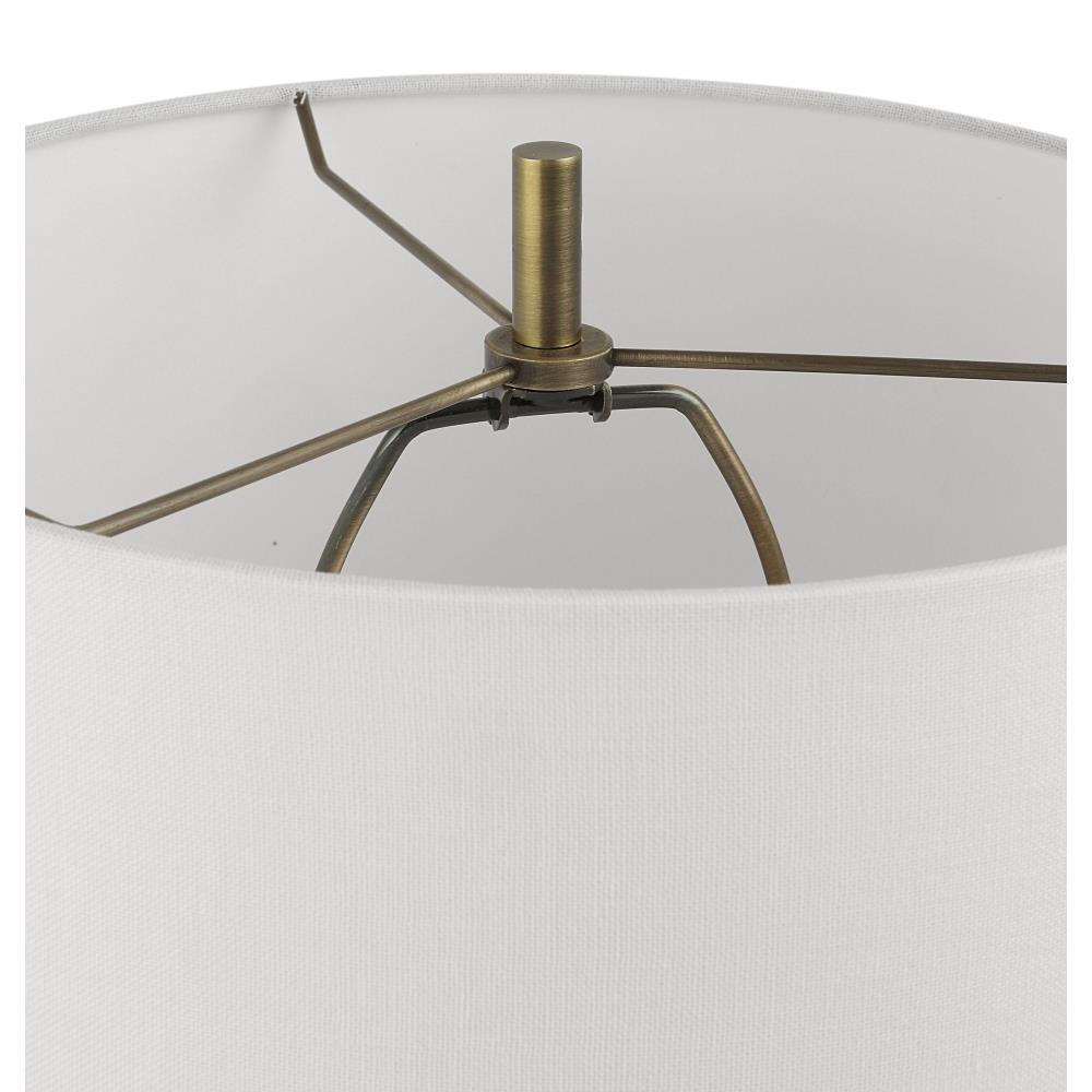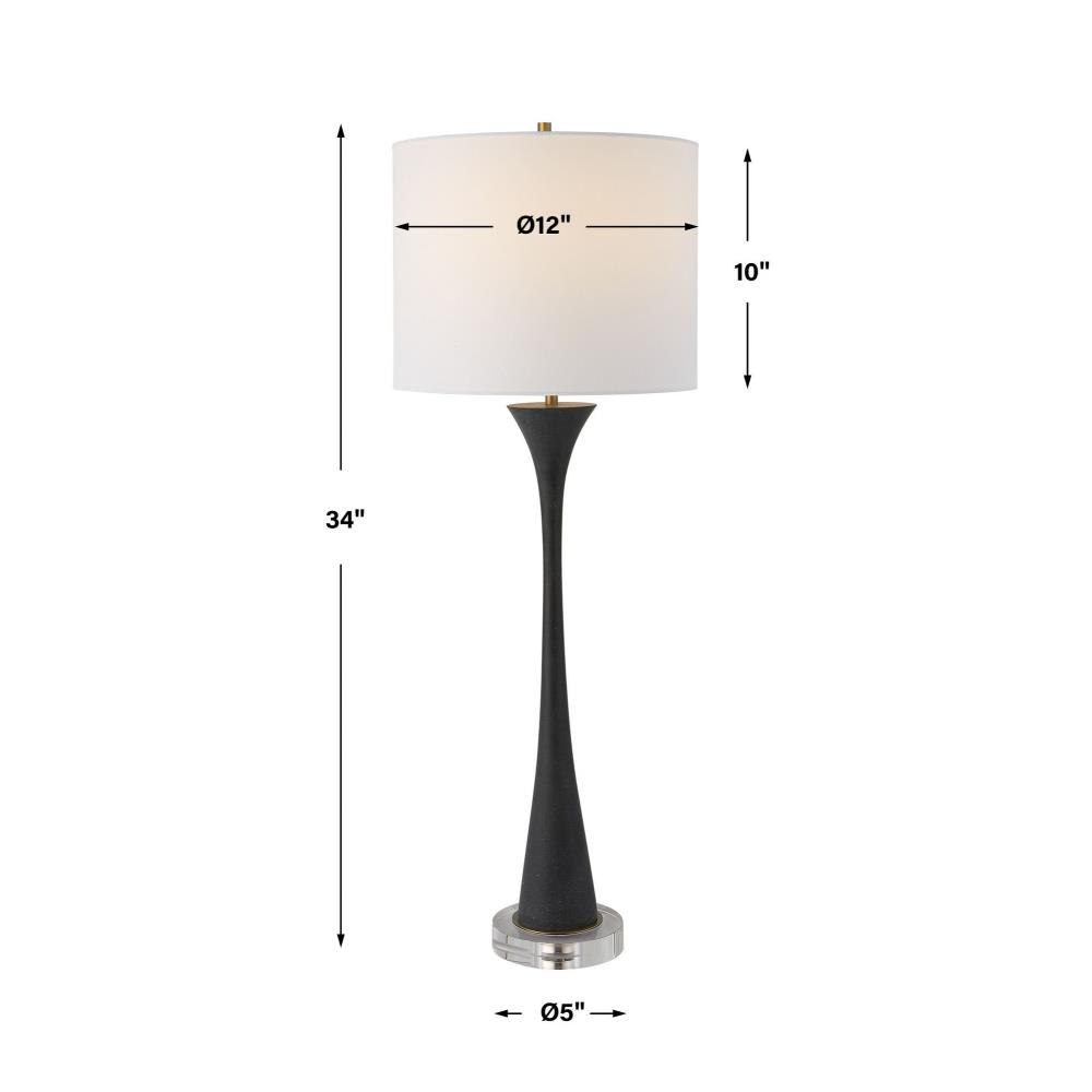 Showcasing A Classic Trumpet Shape, This Buffet Lamp Is Handcrafted From A Man-made Black Stone, Displayed On A Thick Crystal Foot, Paired With Brushed Brass Plated Accents. A White Fabric Shade Completes The Piece.