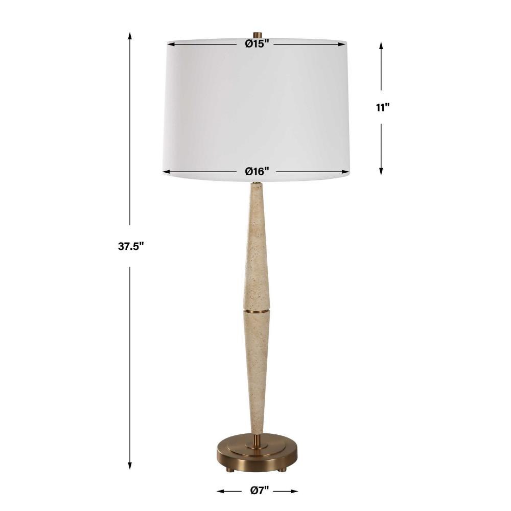 This Table Lamp Combines Modern Silhouette With Organic Textures And Materials Featuring Two Cone Shaped Pieces Of Light Beige Travertine Separated By Iron Details Finished In Plated Brushed Brass. The Slightly Tapered Round Hardback Shade Is Covered In White Linen Fabric.