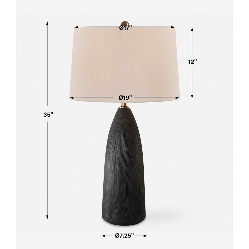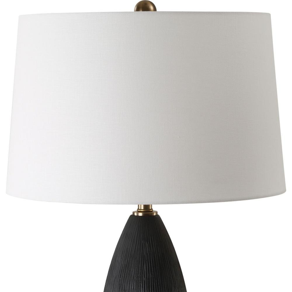 The Jett Table Lamp Showcases A Matte Black Ceramic Base With Organic Texturing, Accented With Plated Antique Brass Details. The Tapered Round Shade Is A Casual White Linen Fabric.