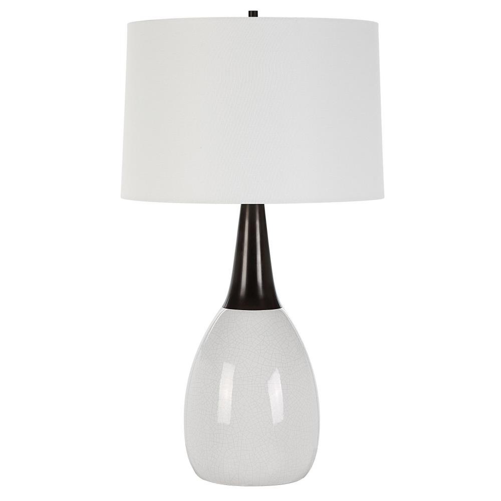 This Unique Table Lamp Seamlessly Blends Elegance And Uniqueness Into One Captivating Design. The Crackled White Ceramic Base Flows Gracefully Into A Black Iron Fluted Neck, Creating A Striking And Seamless Transition. The Lamp Is Topped With A Slightly Tapered Round Hardback Shade In A Crisp White Linen Fabric.