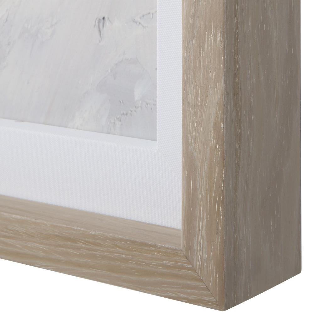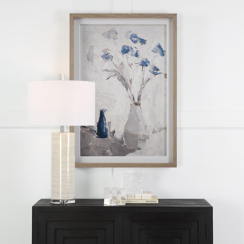 This Contemporary Still-life Features An Array Of Cerulean Mixed With Dove Gray And Natural Cream. The Arrangement Is Surrounded By A White Linen Mat And A Gray Washed Pine Wood Frame. Artwork By Julie Denise.