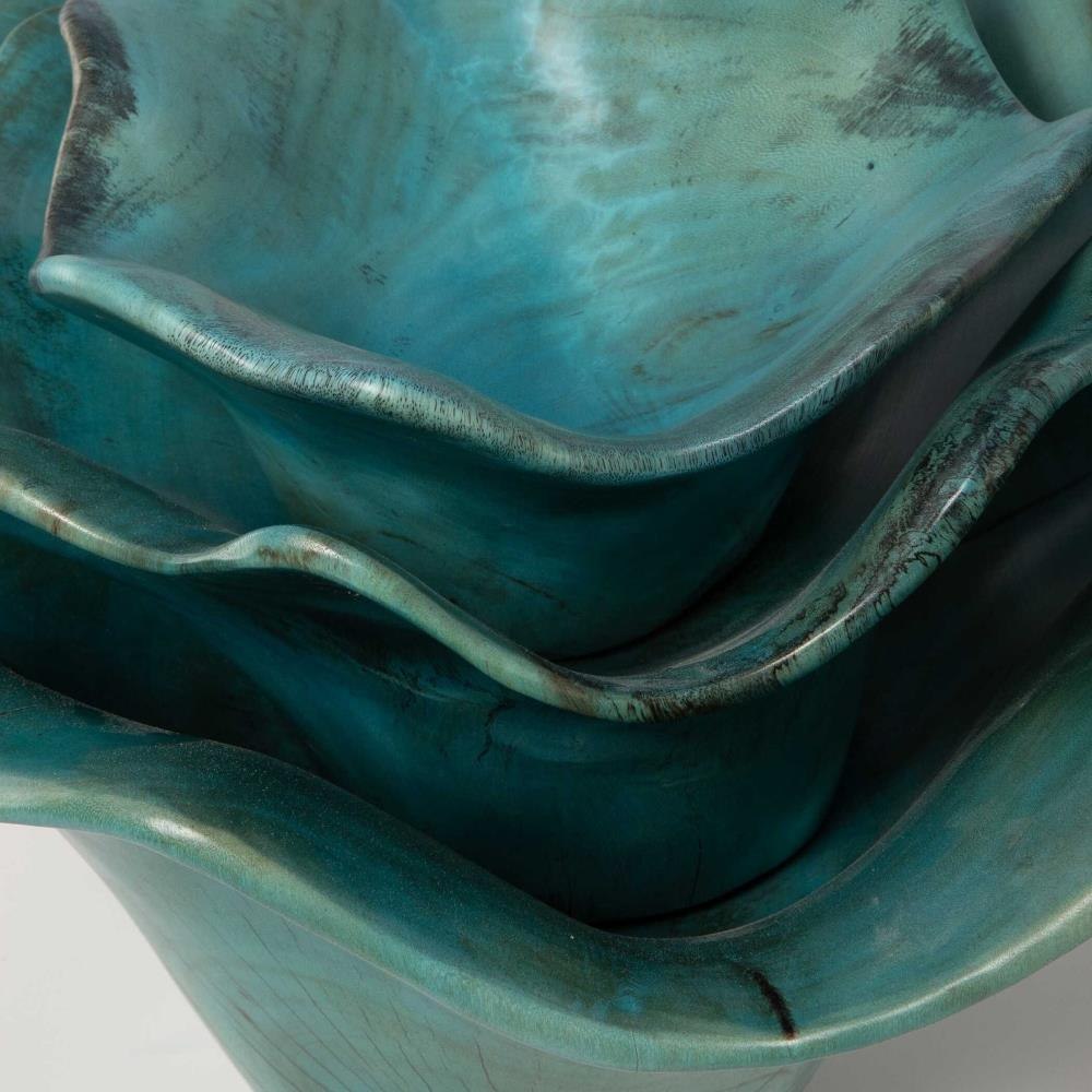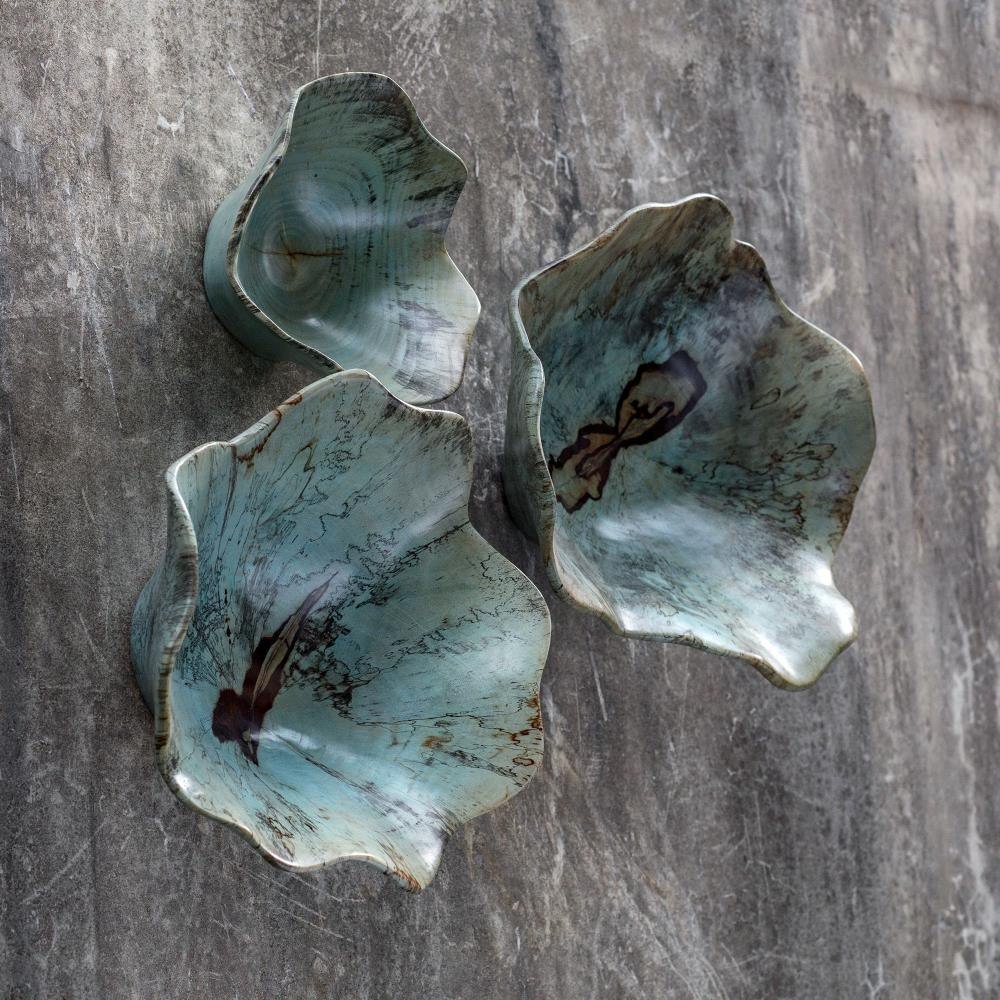 This Set Of Three Wood Wall Art Features Naturally Spalted Tamarind Wood, Finished In A Soft Blue-green. Because Each Is Individually Handcrafted, Sizes May Vary. Cracks And Variations In The Grain Are Natural To This Type Of Wood. Sizes: Sm-10x10x5, Med-15x15x7, Lg-16x16x7.
