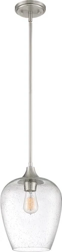 Tapered shades in clear seedy glass pair effortlessly with the body's brushed nickel finish. Layered arms extend beyond the candle supports, contributing to the contemporary appeal, and delicate rivet details create a perfectly polished look.