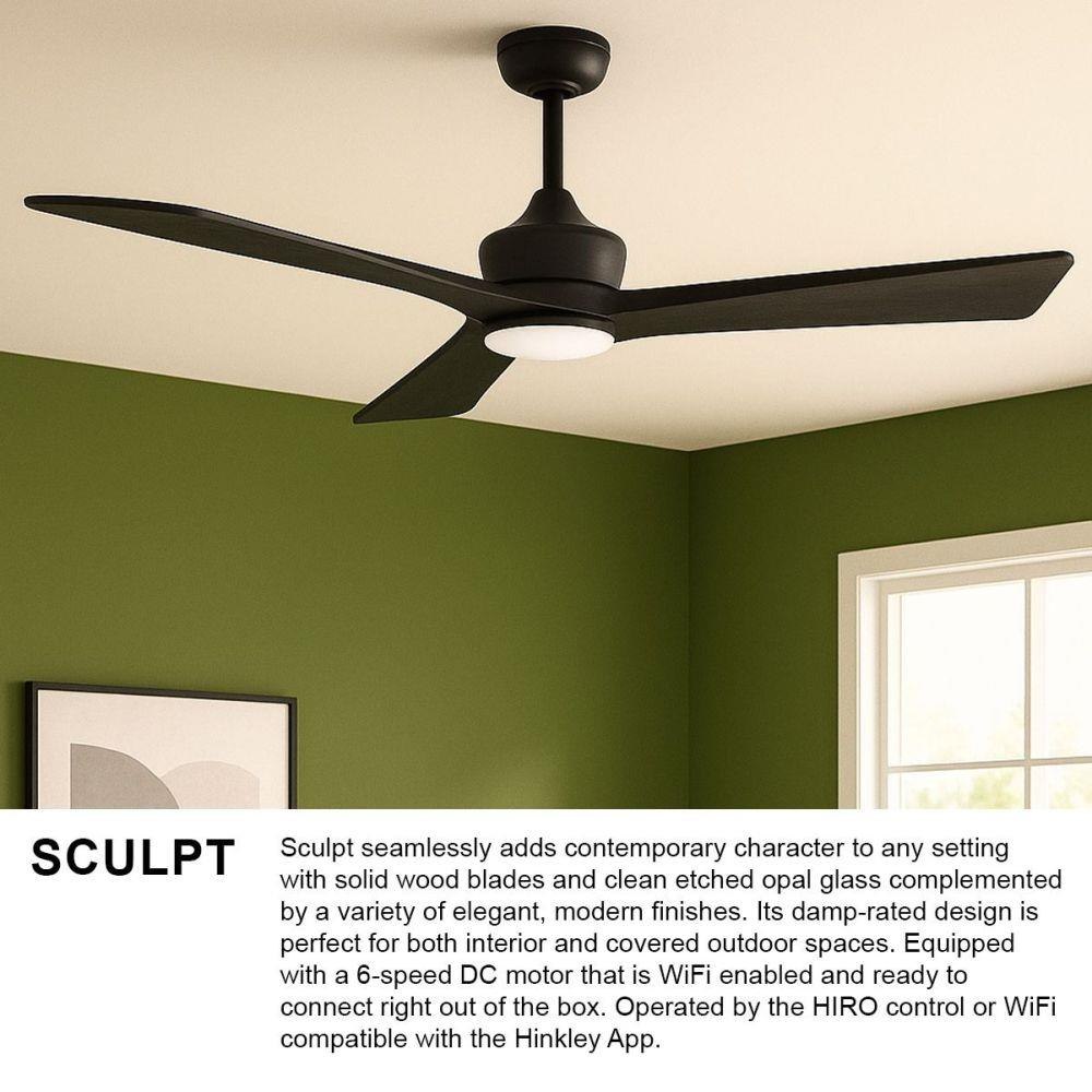 Sculpt defines modern elegance, featuring solid wood complemented by clean etched opal glass, seamlessly adding contemporary character to any setting. Available in a variety of finish and blade combinations. Damp rated for both interior and covered outdoor spaces. Equipped with a 6-speed DC motor that is WiFi enabled and ready to connect right out of the box. Operated by the HIRO control or WiFi compatible with the Hinkley App.
