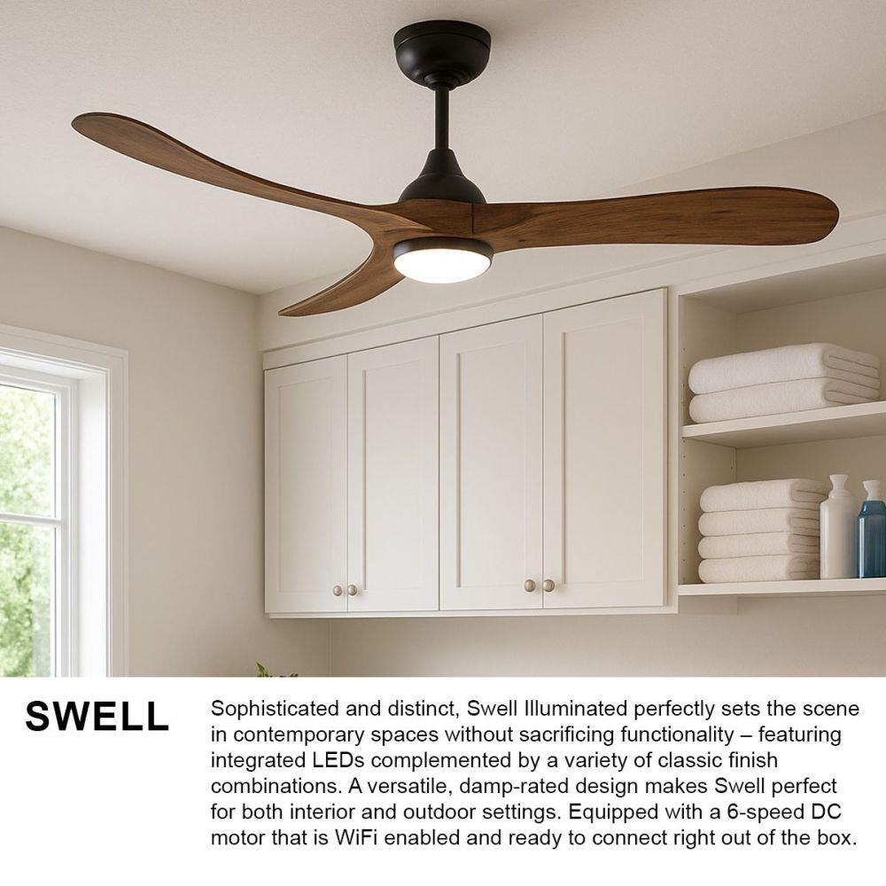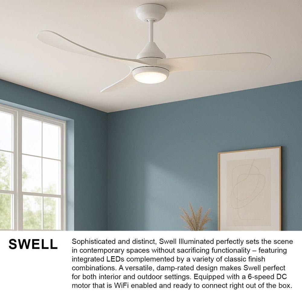 Sophisticated and distinct, Swell Illuminated perfectly sets the scene in contemporary spaces without sacrificing functionality – featuring integrated LEDs complemented by a variety of classic finish combinations. A versatile, damp-rated design makes Swell perfect for both interior and outdoor settings. Equipped with a 6-speed DC motor that is WiFi enabled and ready to connect right out of the box. Operated by the HIRO control or WiFi compatible with the Hinkley app.