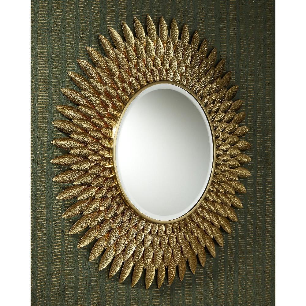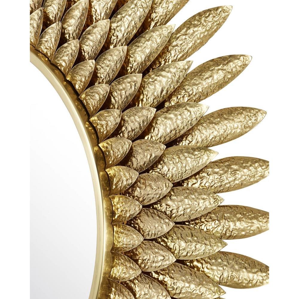 A beautiful burst of brass feathers, the Plume Round Mirror is a remarkably artistic creation, with each of the hundreds of hand-cut and hand-hammered faux feathers affixed to the frame one after another by artisan hand. The rows graduate from largest to the smallest as they move toward the mirrored glass.