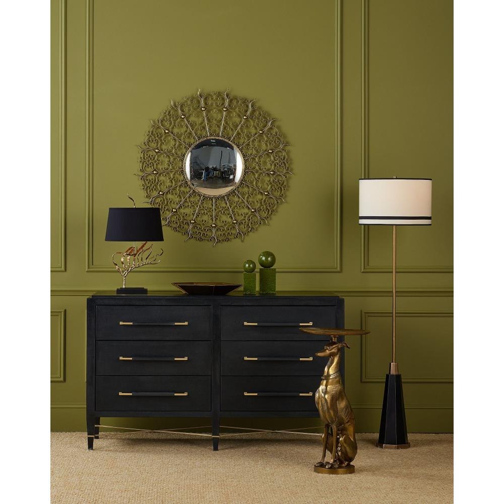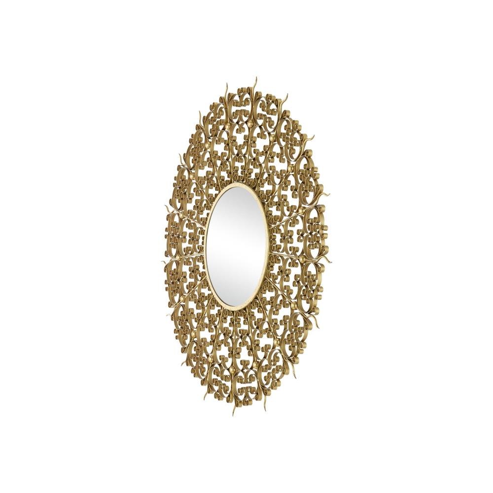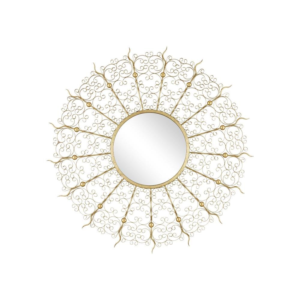 Add a touch of timeless elegance to your space with the Levain Round Mirror. Featuring a stunning convex mirror at its center, this eye-catching piece is framed by intricate ornamental scrollwork that echoes the charm of vintage gates and ornate screens. The swirling metal design with a gold leaf finish radiates outward in a dramatic sunburst shape, creating a sense of movement and sophistication.