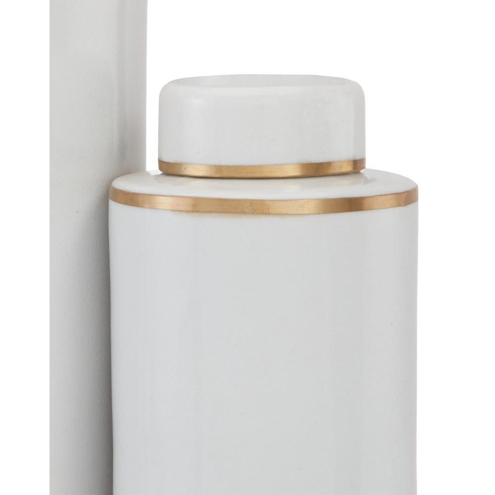 The Ivory Tea Canister Set is a pair of hand-painted stoneware canisters in a pale ivory reactive color with a delicate crackle running along the surfaces of both of the round decorative accessories. A sophisticated touch is added with the brass rings that are affixed to the stoneware vessels.