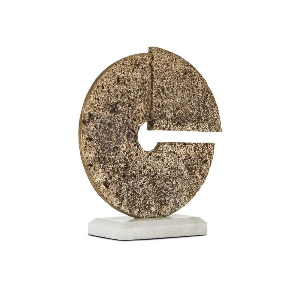 The Daman Brass Disc has a heavily pitted surface that is rougher than a rough-case treatment, which brings the gold sculpture an intense texture. Adding to this effect is the aged brass finish that collects in the larger crevices to create added patina. A design detail of note is how the rectangular marble base is beveled. The Dany Brass Disc is a similar design in a larger size.