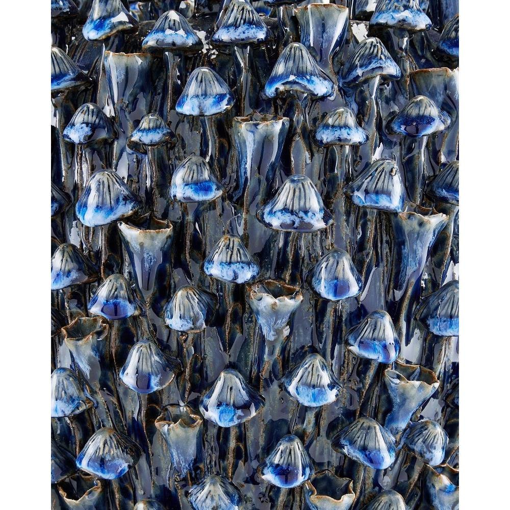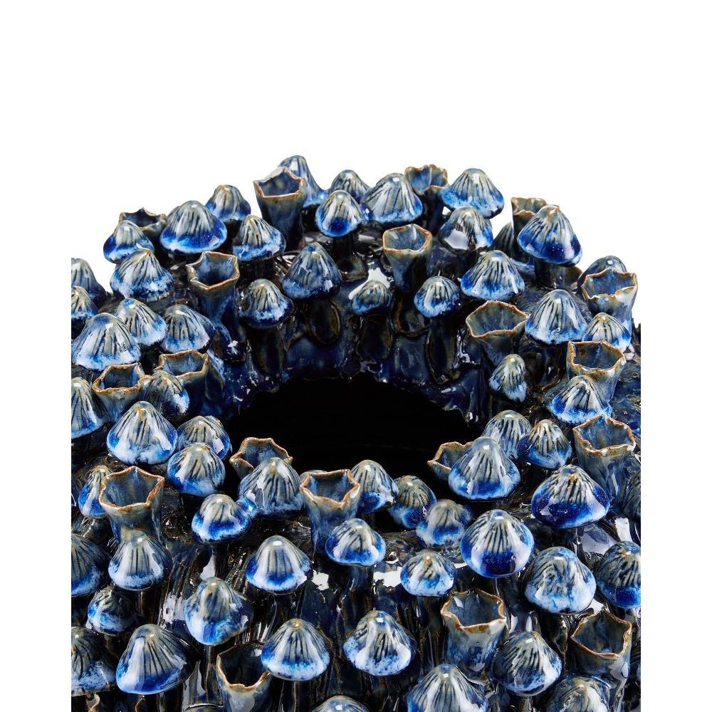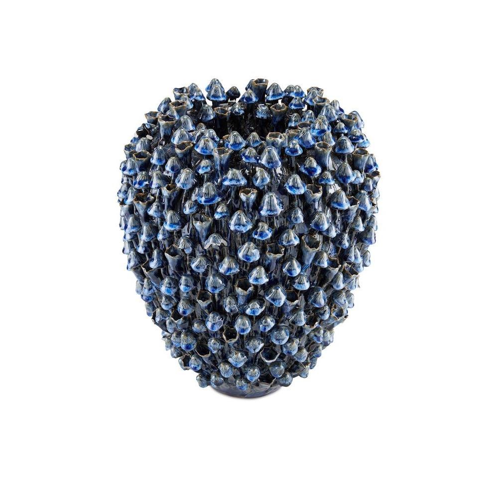 The Manitapi Large Blue Vase is made by a group of women who live at the border of Burma and Thailand. Made from black terracotta, this incredible hand-thrown dark blue vase is completely covered in handmade bell-shaped flowers, a painstaking process that takes many hours with each vase. Once the blossoms are in place, the vase is glazed with a deep blue.