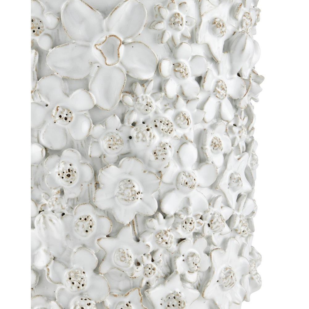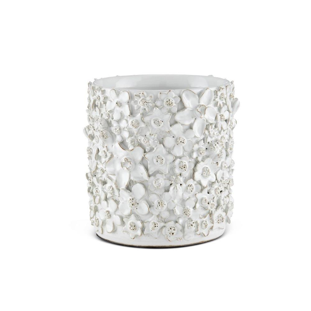 With a surface that is studded with beautifully fashioned white flowers, the Jessamine Small White Cachepot is truly an artisanal piece. Rather than apply one type of bloom, a number of floral shapes are intermingled to give the white decorative accessory a charm. The handmade character of the piece comes from the fact that each flower is created individually and applied, one-by-one, by hand. The white planter will be a plant's biggest complement.