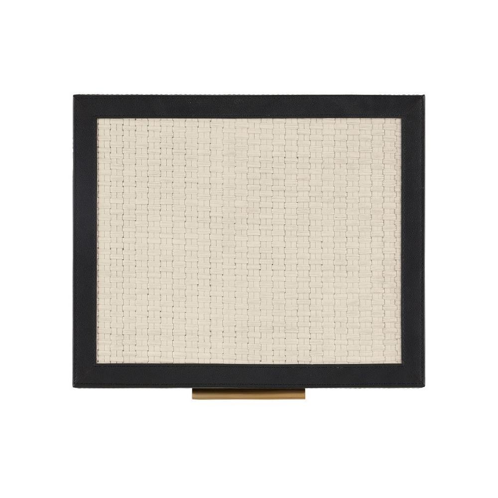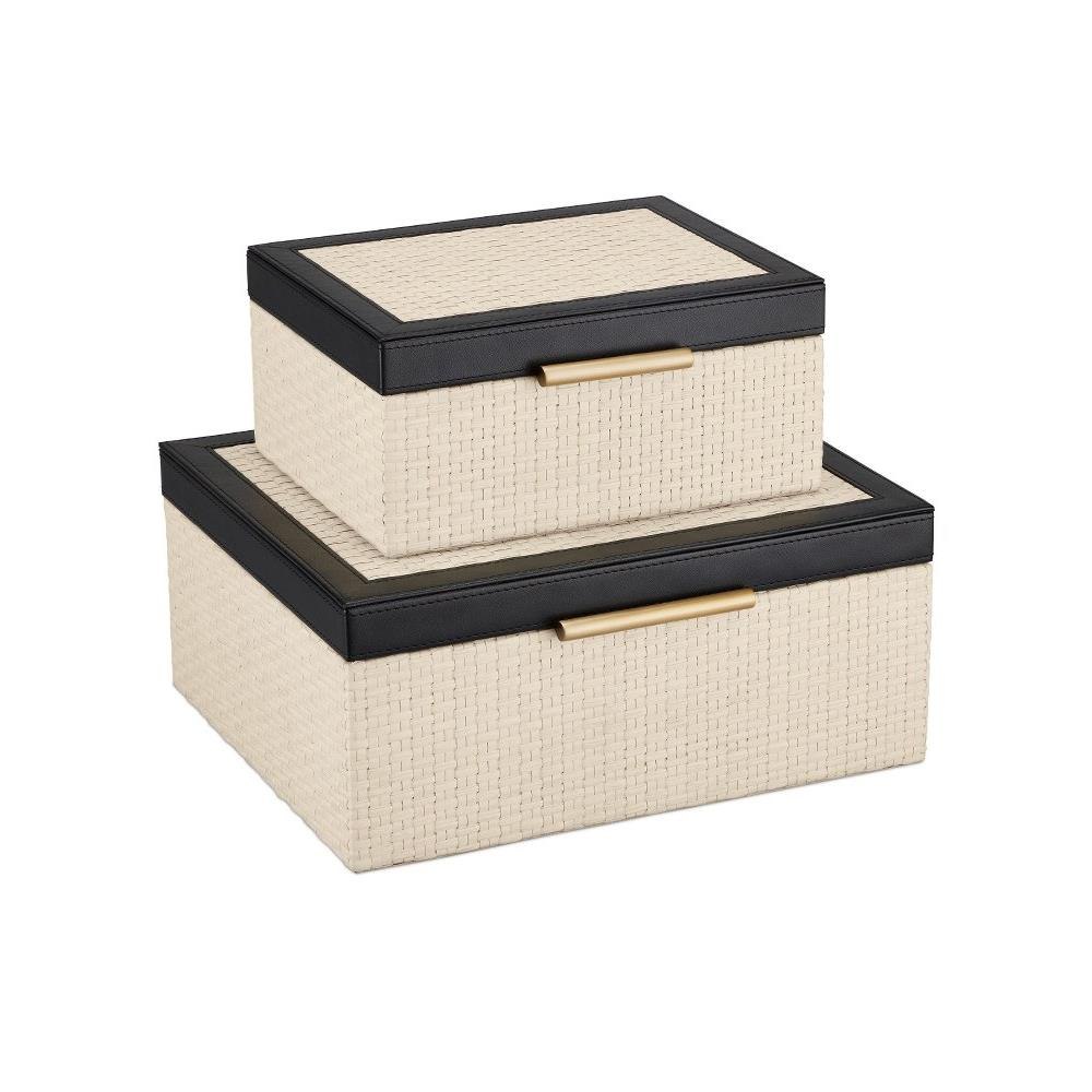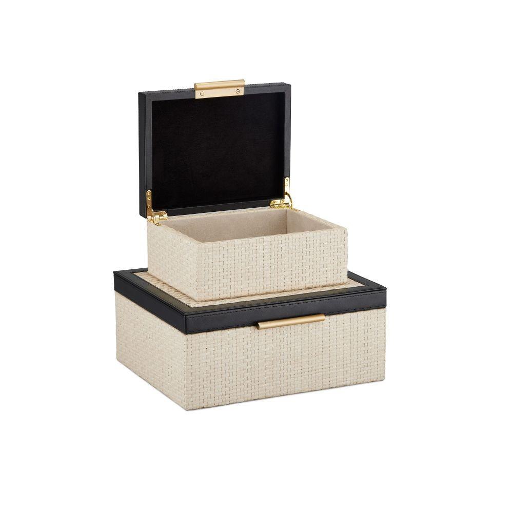 Made of intricately woven ivory raffia, the Deanna Box Set includes two sizes of decorative boxes with black leather tops, and light antique brass handles and hinges. The interiors of these black and ivory boxes are lined with beige micro suede for a luxurious feel. The uniformity of the weave on these boxes is created during a painstaking artisanal process.