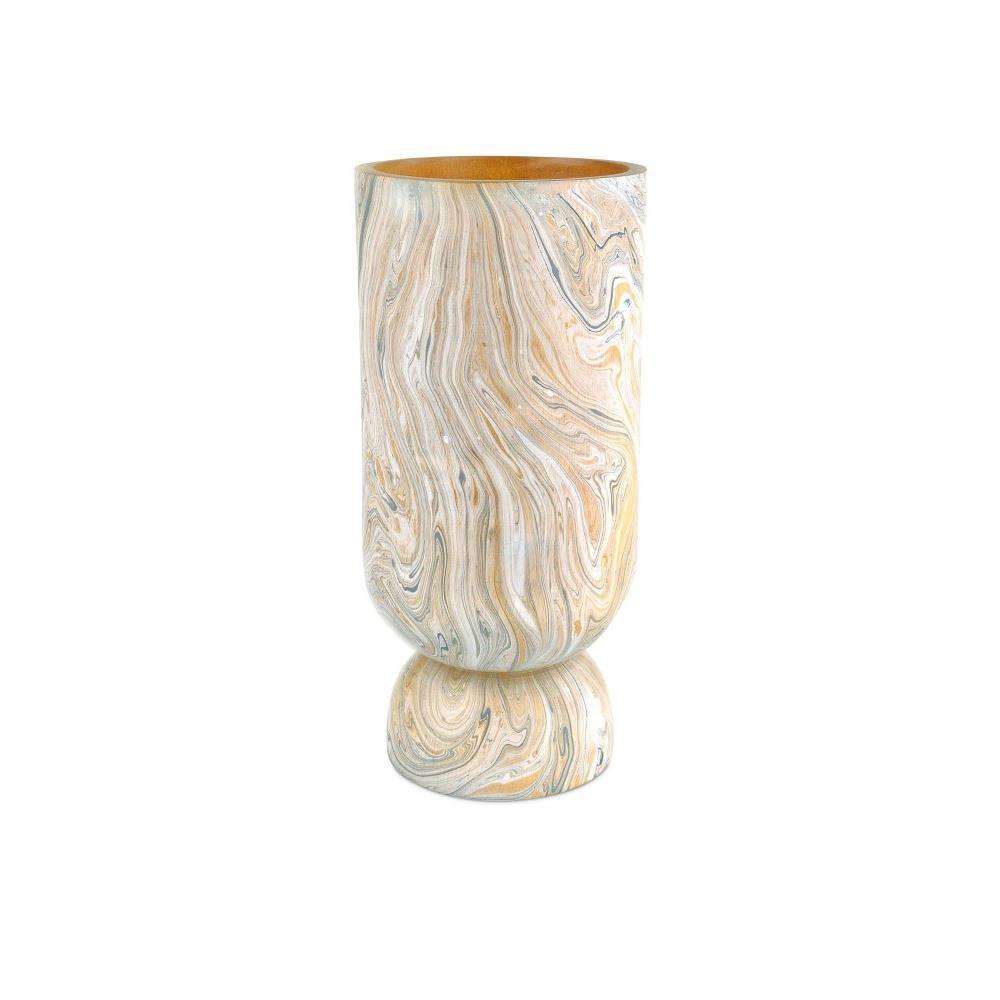 Made of wood, the London Sky Vase Set includes three gray and peach vases with swirling patterns along their surfaces, which have been hand-painted for a marbleized effect. The neutral tones of tan, peach, white, and gray bring these tan decorative accessories a textural feel. The patterning on these multicolored vases will make them dynamic elements in a room.