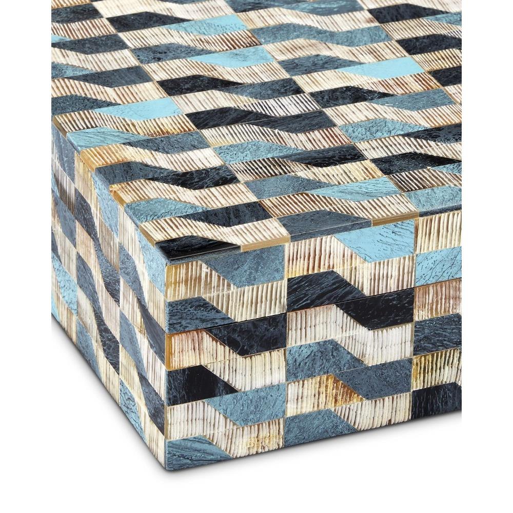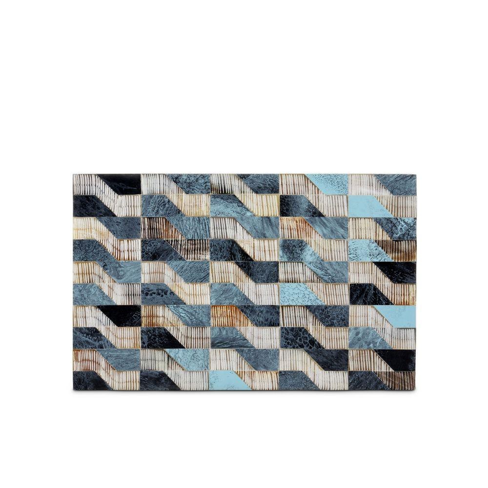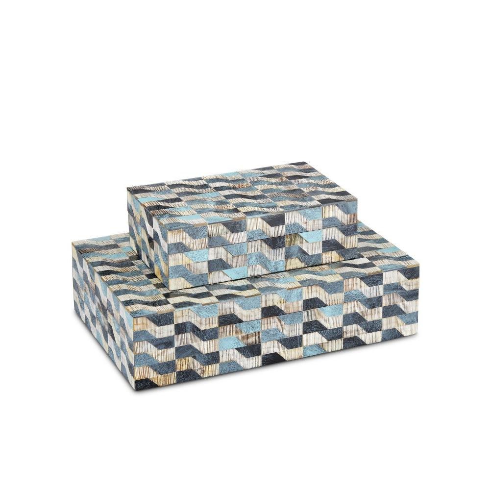 The Ezra Box Set includes two decorative boxes that are made of alternating colors of bone and chiseled horn. The wavy pattern is created when blue, brown, and ivory colored bone and horn are hand-applied to the surface to make the boxes artisanal accessories that pack a textural punch. The interiors of the boxes are linen-lined for a sophisticated feel.