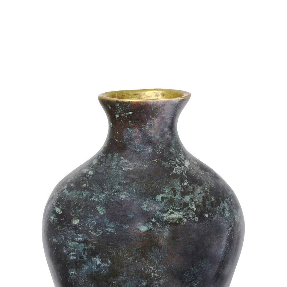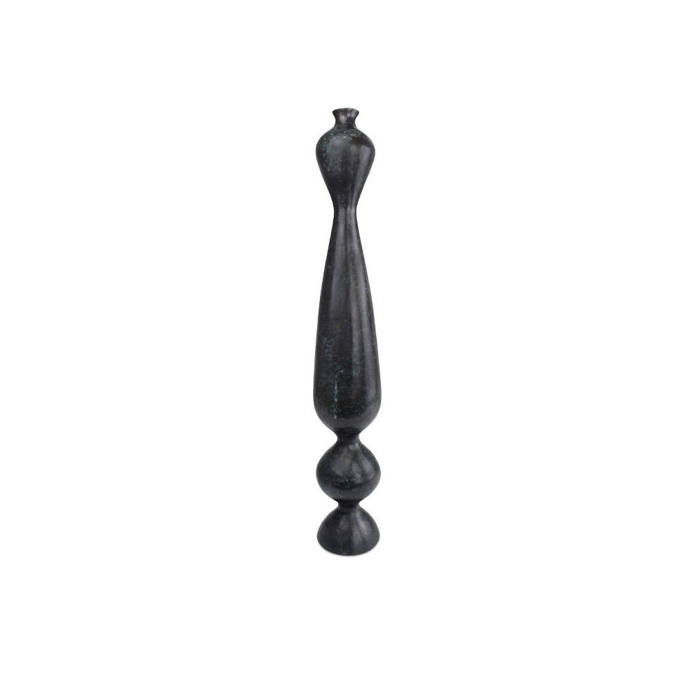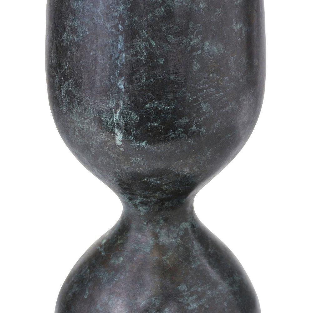 The Luganzo Large Bronze Vase has the undulant character of turned wood, but the sculpture is made of bronze with a jade green patina. A polished gold ring defines the culmination of its neck for a hint of sheen. The incredible distressing the artisans achieved with this vase after it has emerged during a lost-wax technique makes it a stunning textural piece that will read like an antique.