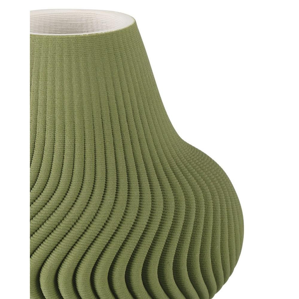 The Green Plisse Large Vase is attractive in a lovely hue of olive green. The deep furrows that that swirl around the bulge in its form tighten and straighten as they flow to the top and to the bottom in a uniformity that can only be machine made. The most surprising thing about this handsome vessel is that it is made of 3D-printed porcelain, an ancient material you might not expect to be so amenable to such a contemporary process.