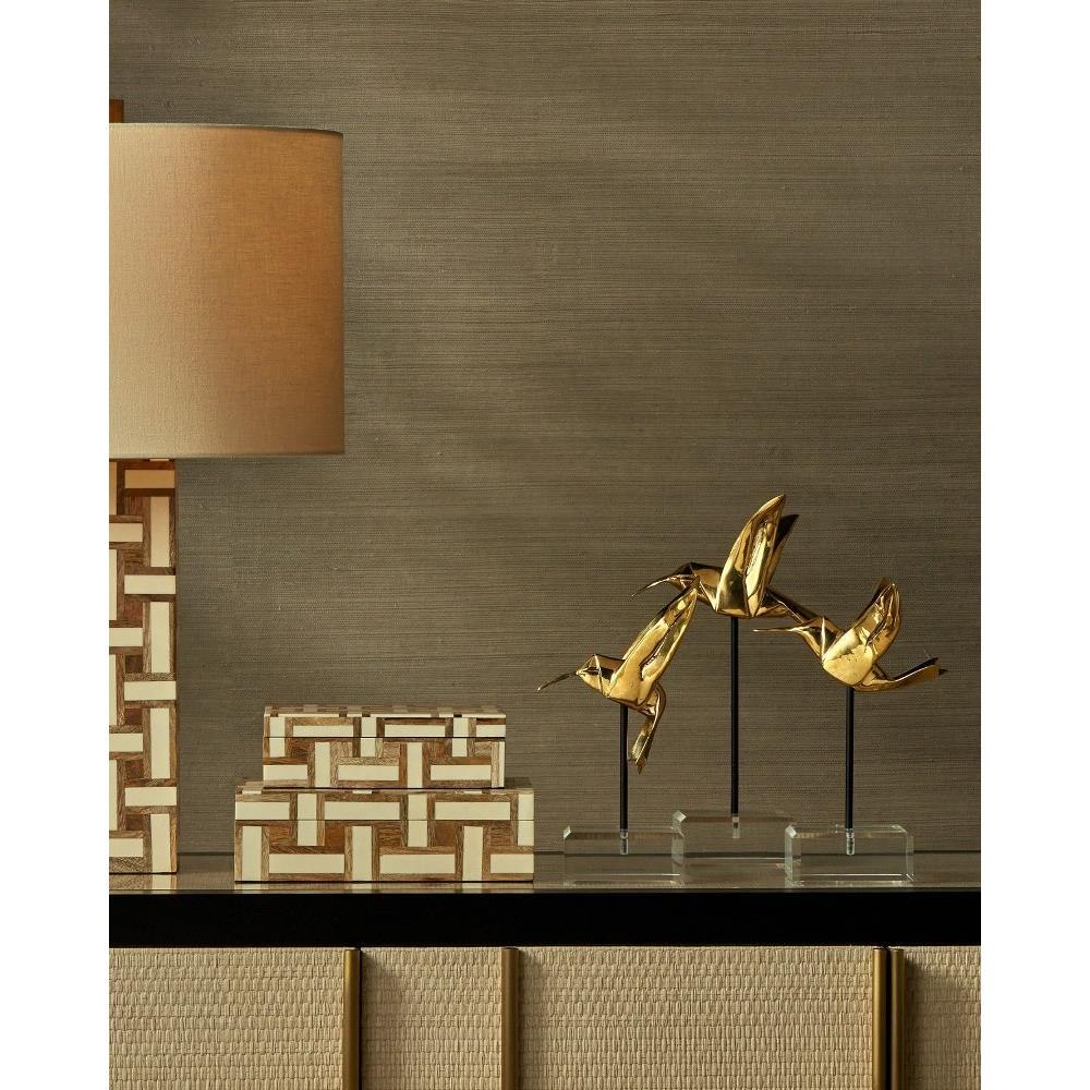 The Gold Hummingbirds Set of sculptures includes three playful figures that look like origami, though they are made of bronze in a gold polish finish to resemble folded paper forms. The way the sculptures are perched on black rods that affix them to acrylic bases furthers the impression they are hovering as real hummingbirds gracefully do. This set of gold sculptures captures the birds in different stages of flight.