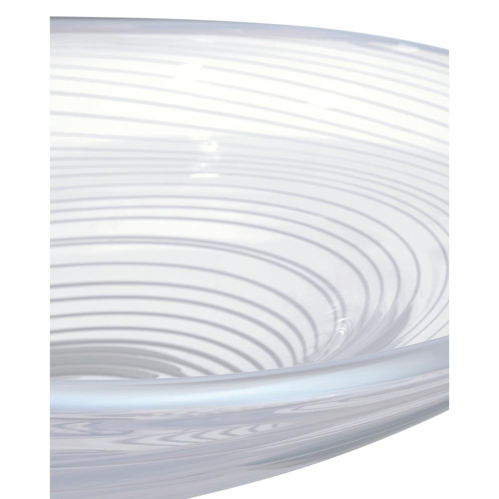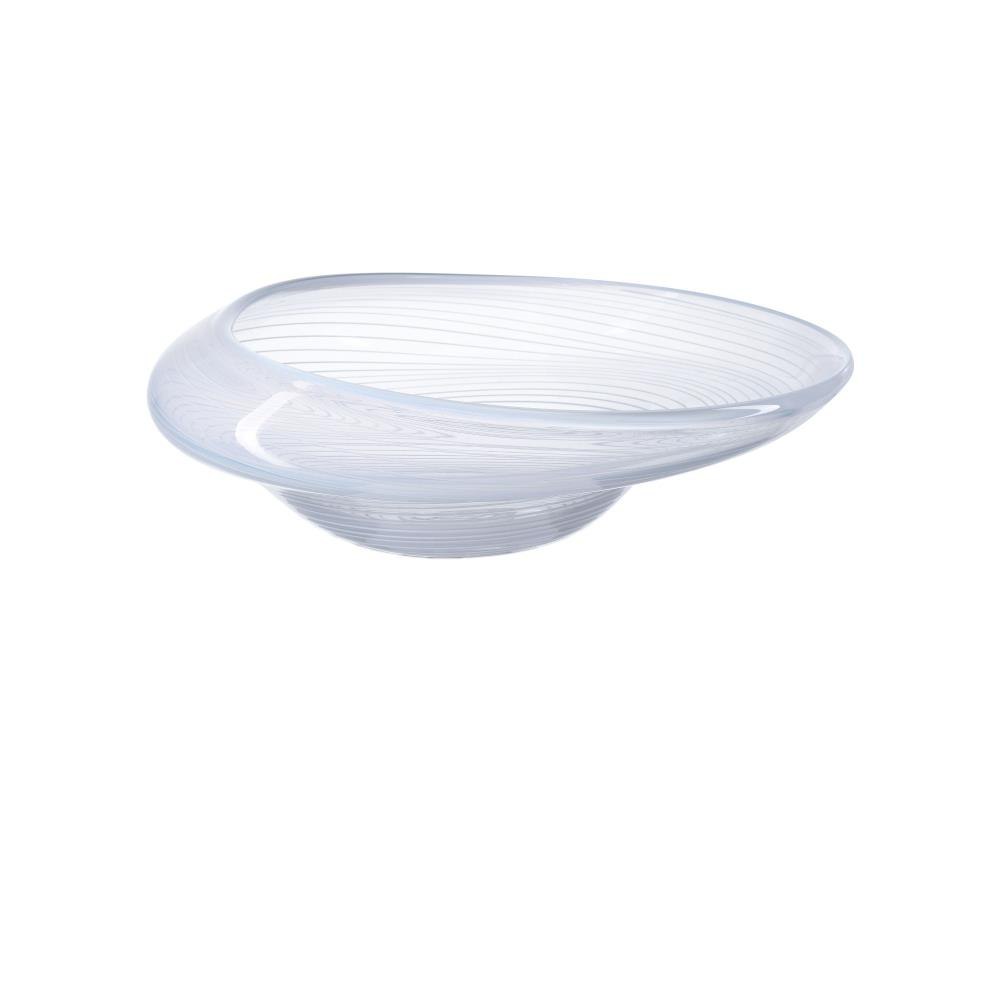 The Bonaventure Bowl is a stunning piece made from pale gray mouthblown glass. Delicate swirling lines create textural striations across the surface, giving the bowl a sense of movement and depth. Each bowl is individually handcrafted, beginning with molten glass dropped from the blowing pipe into an orb, then shaped by hand and cut at the top with scissors to form its unique silhouette. The result is a one-of-a-kind decorative piece with a beautiful, opalescent finish that subtly shifts in the light.