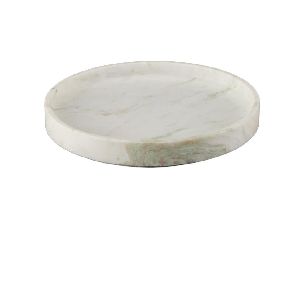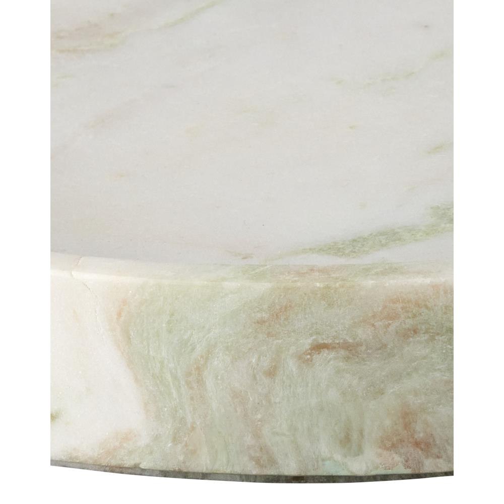 The Bilbao Aravali Onyx Round Tray is made from exquisite Aravali onyx that features delicate pastel pink and green veining. Design highlights include a narrow plinth where the tray gracefully tapers at the bottom and subtle feet that elevate it slightly from the surface. Because this is a natural stone, the veining will vary slightly from piece to piece.
