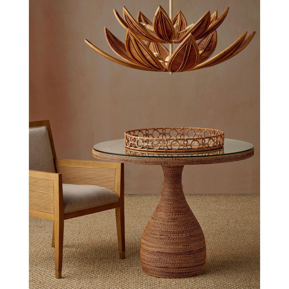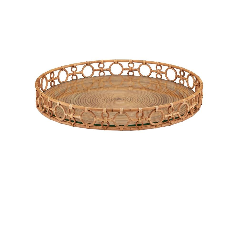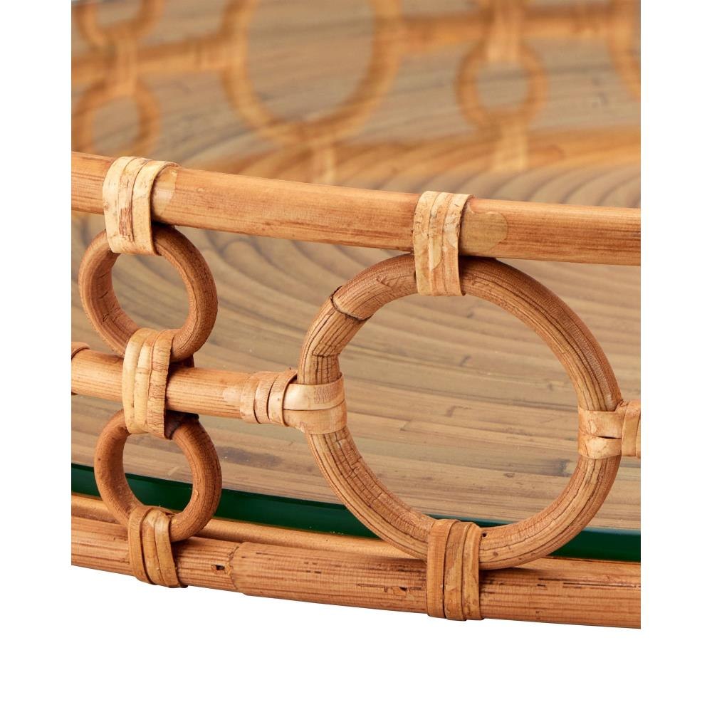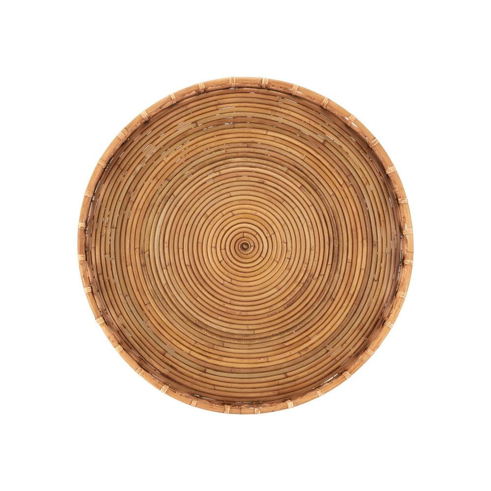 The Tegal Decorative Serving Tray is a stylish and functional accent measuring over twenty-three inches in diameter so it's perfect for creating a table-like surface on an oversized ottoman. Crafted from natural Arurog, it features a geometric looping pattern along the sides that adds texture and visual interest. The tray’s glass inset provides a protective shield, making it ideal for both serving and display.