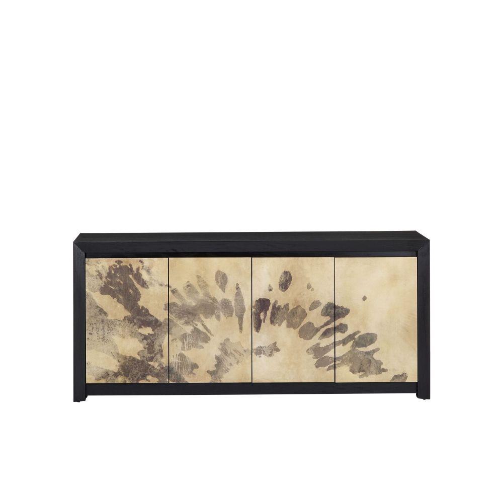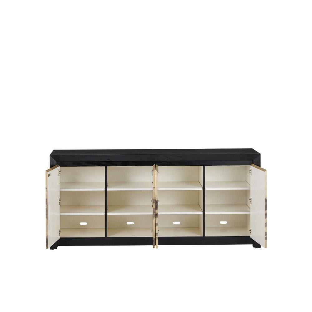 The Karlson Credenza is made of solid oak covered with natural vellum veneer. The caviar black finish on the frame complements the artful pattern on the doors. Soft-close hinges, eight adjustable shelves, adjustable glides, a center foot with a leveler, cord management, and anti-tip kit make this tan and black credenza a well-made choice. We also offer the Karlson in a console table.