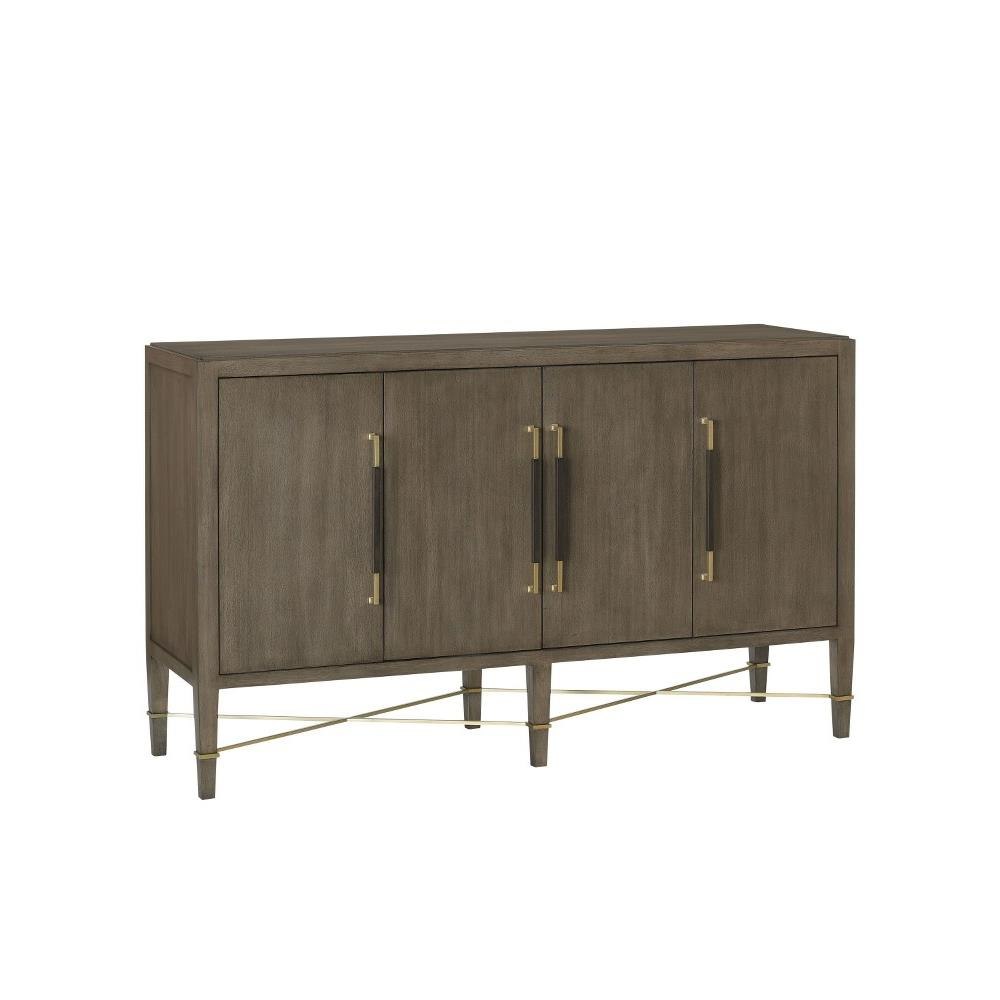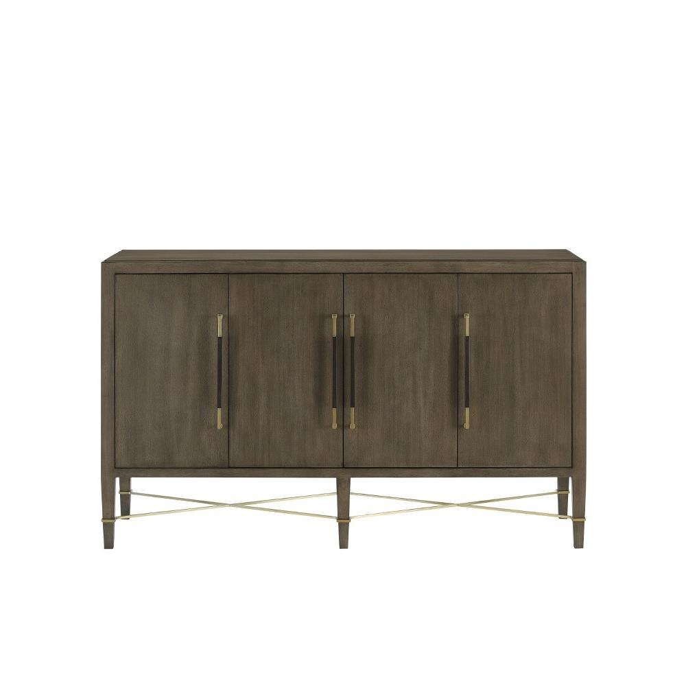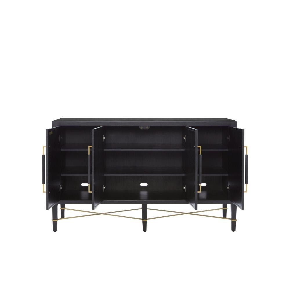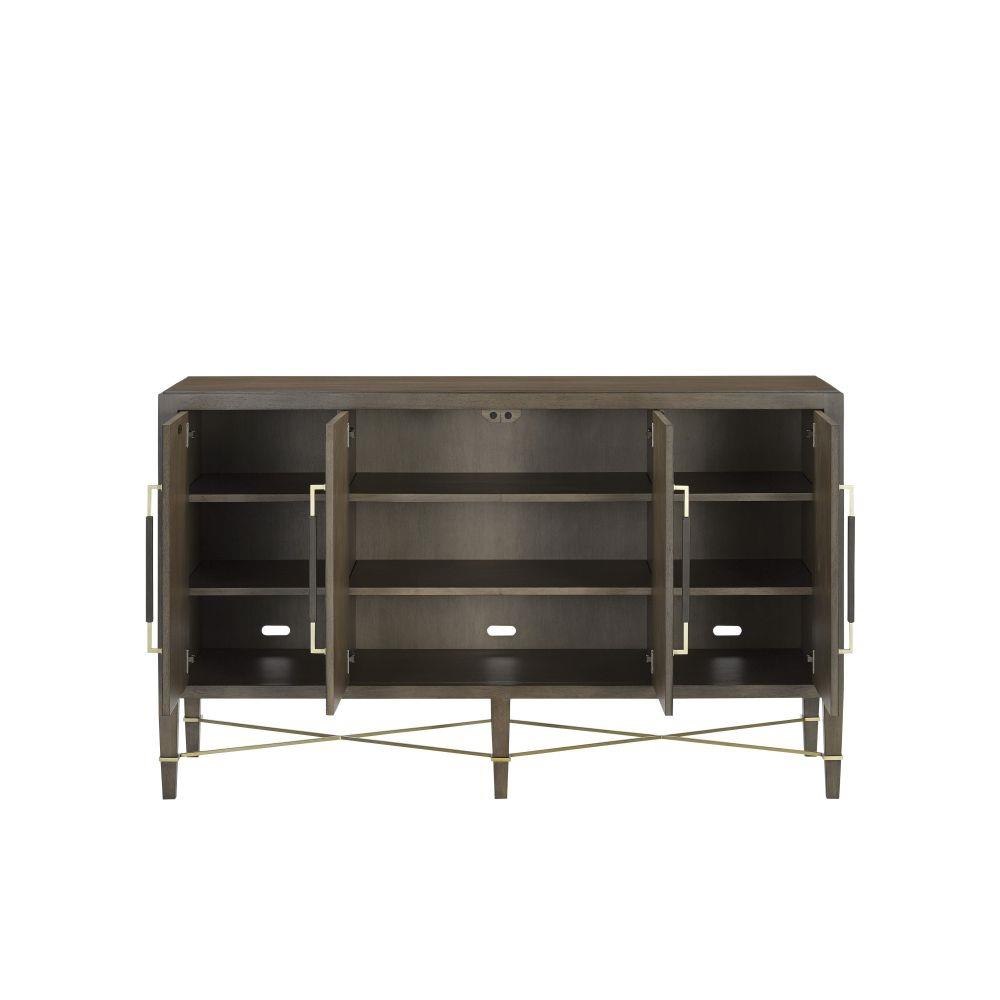 Made of mahogany in a woodland-inspired chanterelle finish, the Verona Chanterelle Sideboard is warmly handsome with its metal detailing in a champagne finish. The stretchers on this brown sideboard bring it its flair. There are a number of pieces in the Verona family of furnishings in both black and brown finishes.Custom Wood Cladded Brass Door Handles, Soft Close Door Hinges, 2 Fixed Shelves, 4 Adjustable Shelves, Cord Management, Adjustable Glides, Anti-Tip Kit.