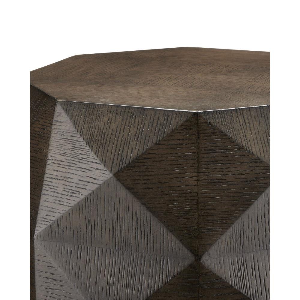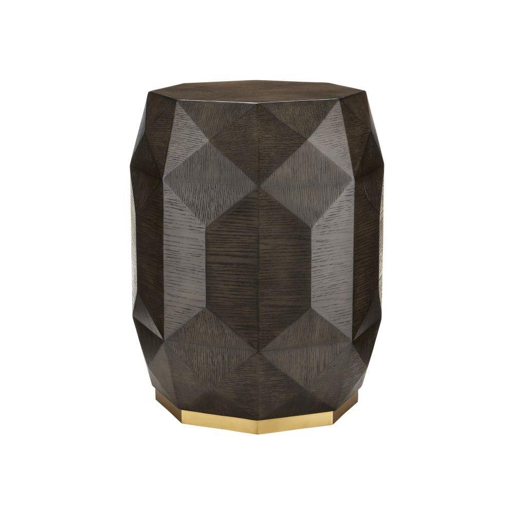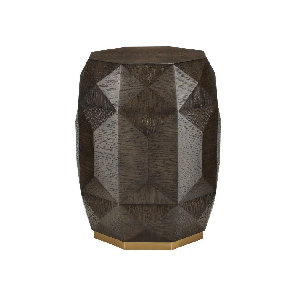 The Kendall Dove Gray Accent Table has an octagonal shape carved from oak solids covered with facets of oak veneers that make it jewel-like. The surface has a dove gray finish that has been wire-brushed to accentuate the grain in the wood. The dark brown accent table sits on a plinth base made of metal in a polished brass finish to add a glimmering touch to the warmth of the gem-like occasional table.