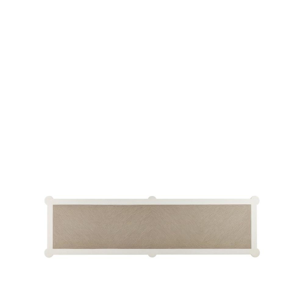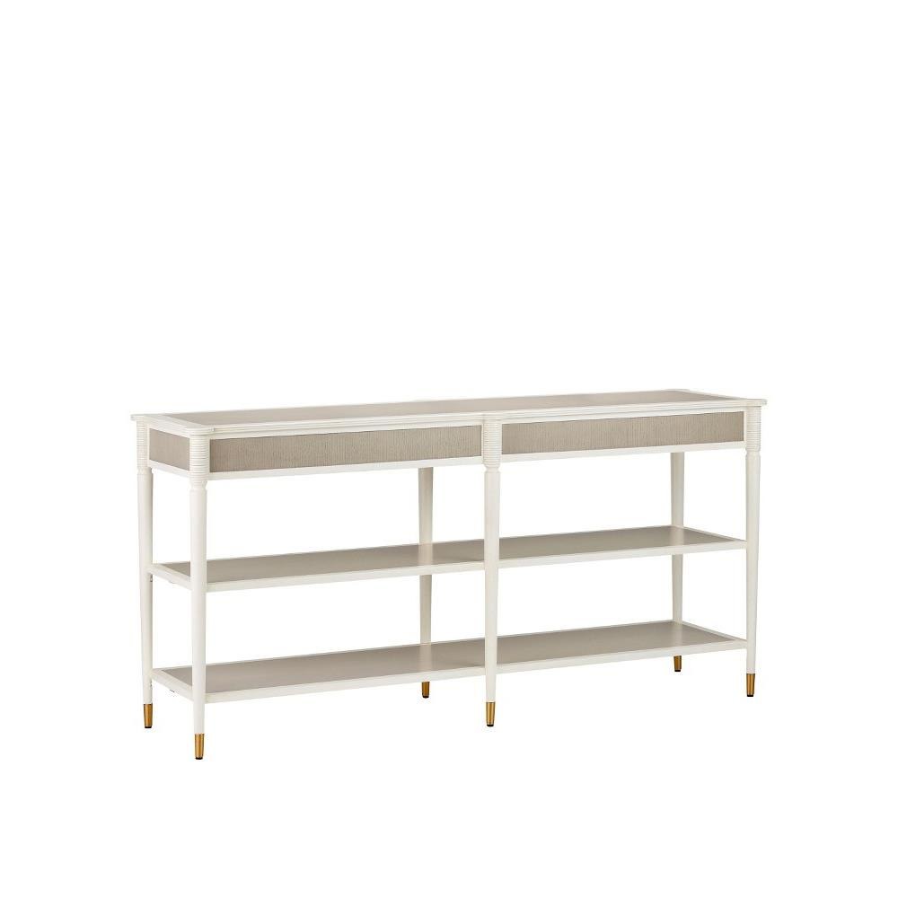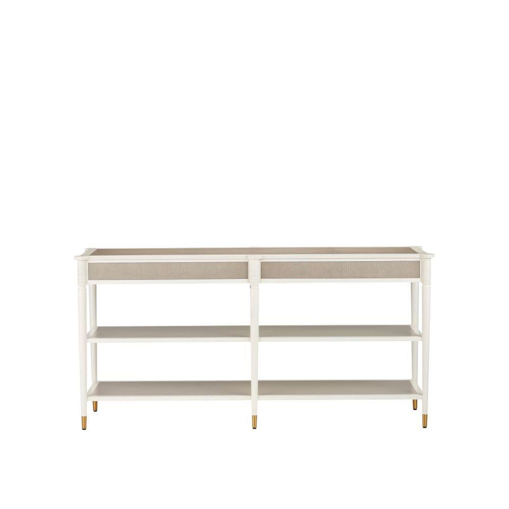 Made of mahogany and oak in a mix of off-white and fog finishes, the Aster Console Table was inspired by an antique from the Winterthur Museum. The gray and white console table has two shelves and is fitted with polished brass ferrules. This piece is in the Winterthur Collection.