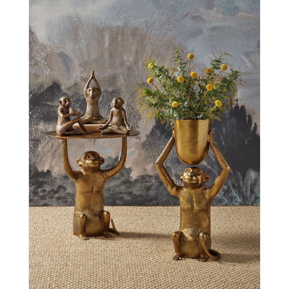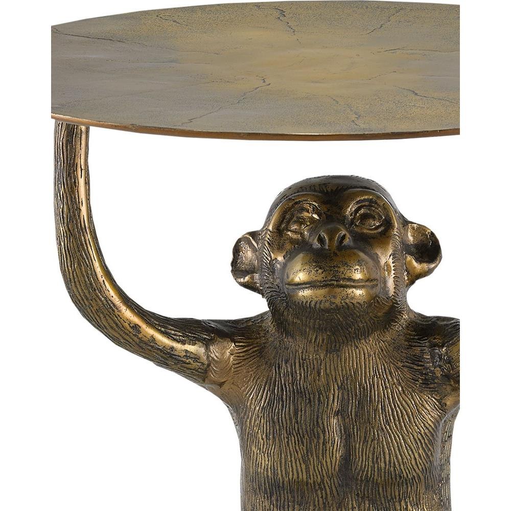 We dont monkey around when it comes to whimsical design. Case in point is our Abu Accent Table with its seated ape, molded in cast aluminum, that lifts its table top with little effort. The antique gold finish that covers the piece makes the gold occasional table read as if it has aged. Creases molded into the top also support the effect that this is a vintage piece.