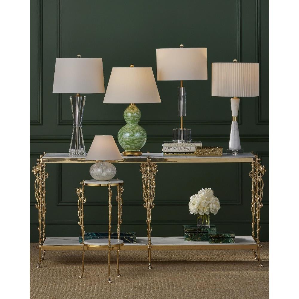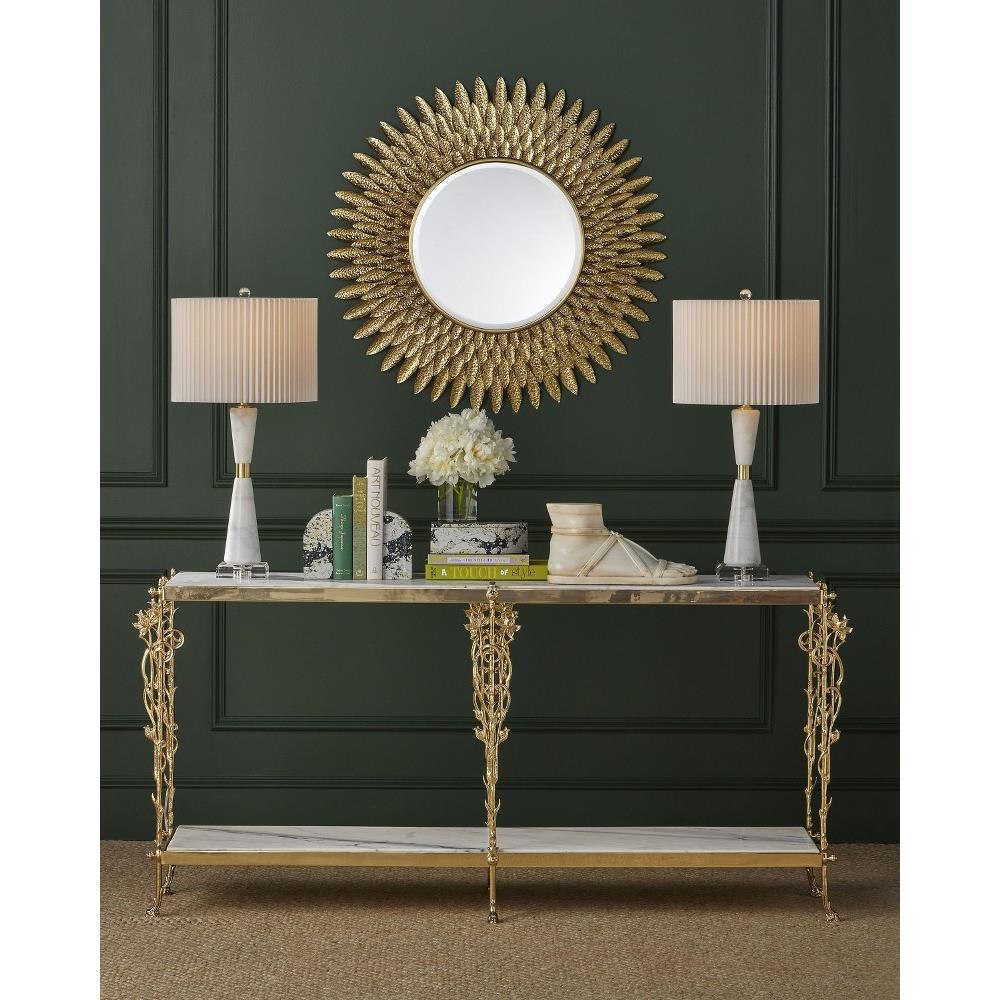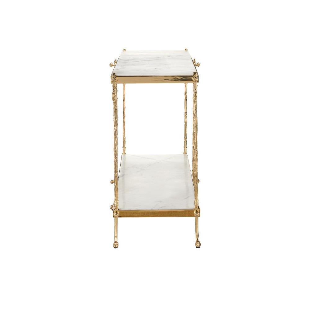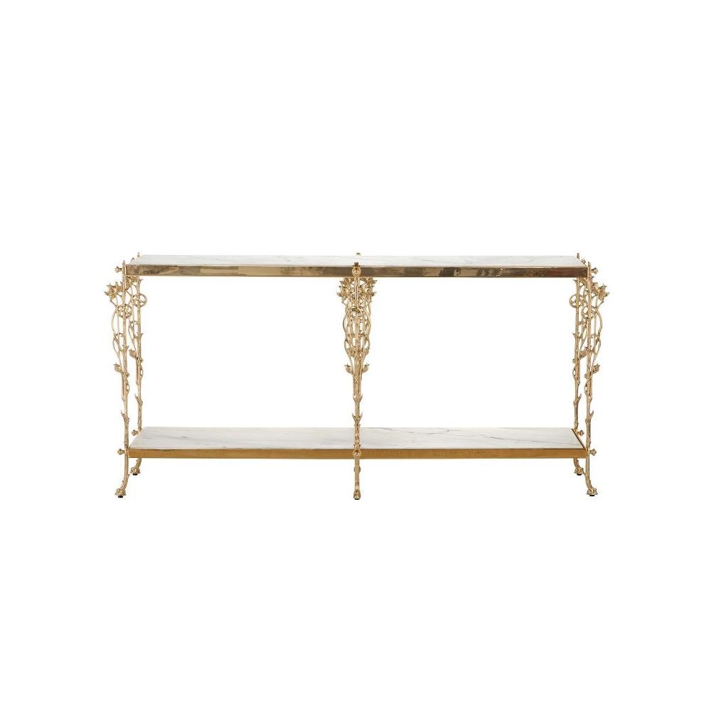 Reflecting its beautiful name, which means flower in Italian, the Fiore Console Table has lovely floral motifs flowing up each of its legs toward a metal band into which a natural white marble top is inset. Just above the graceful ball-shaped feet, another shelf sits, the natural stone a crisp contrast to the luminous polished brass finish.