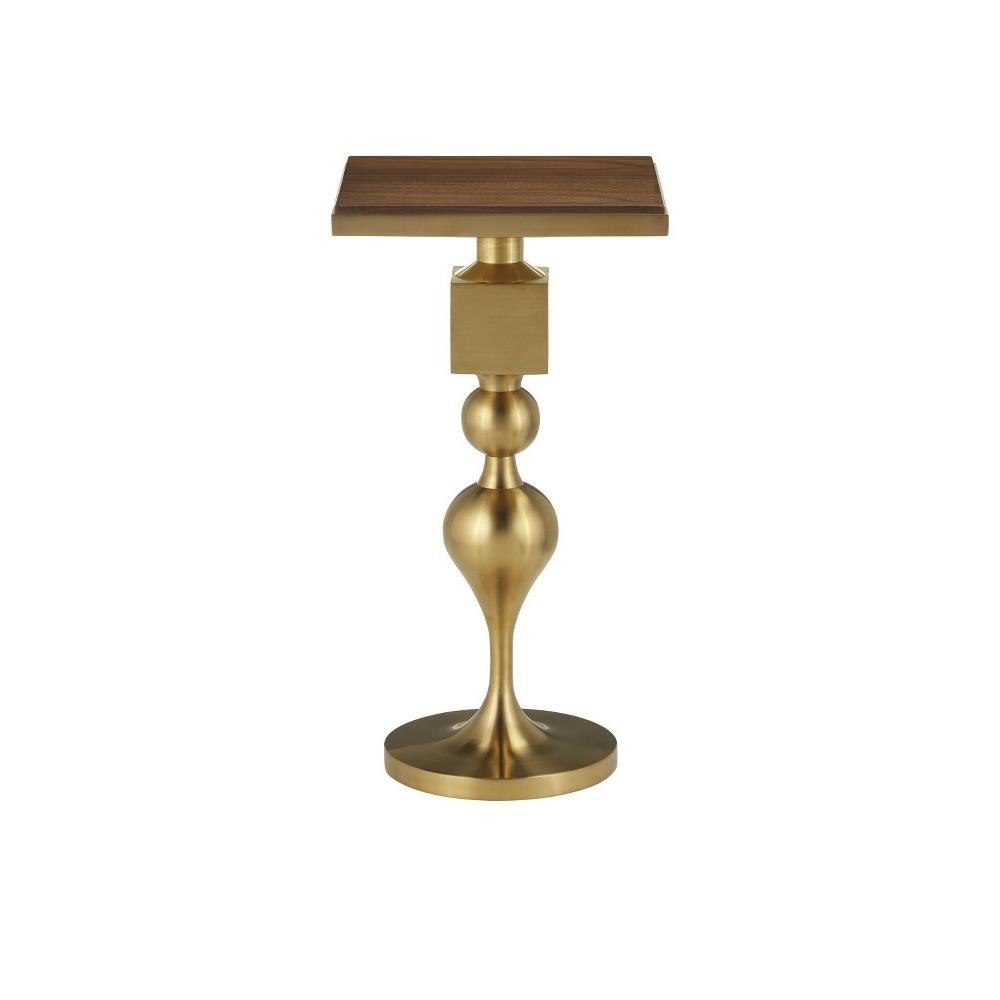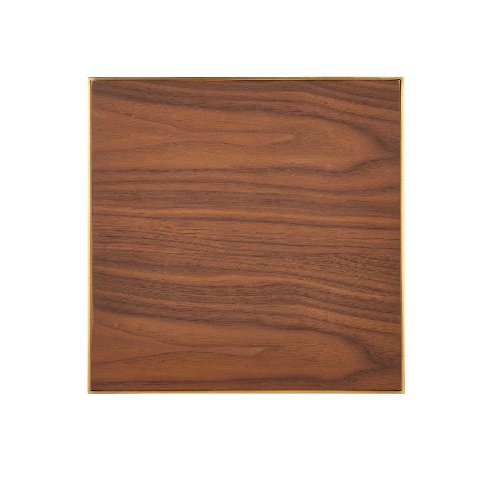Geometric and gorgeous, the Maeve Accent Table is made of stainless steel in a brushed brass finish with an inset walnut top. The gold accent table gets its punch from its series of stacked shapes that rise toward its top, while the square piece of wood brings an uptick in warmth.