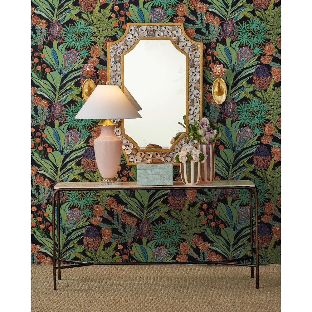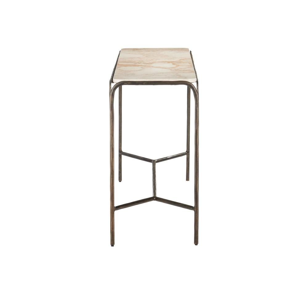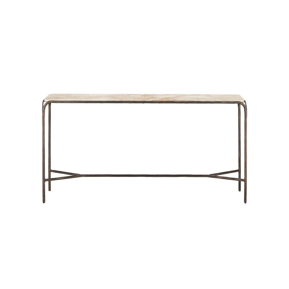 Combining industrial elegance with artisanal craftsmanship, the Crema Console Table is made of metal in a warm bronze finish with a hand-forged appearance that adds depth to its streamlined silhouette. The frame folds down and away from a crema marble top at the corners to create a forked design that matches the ends of the stretchers where they meet the legs.