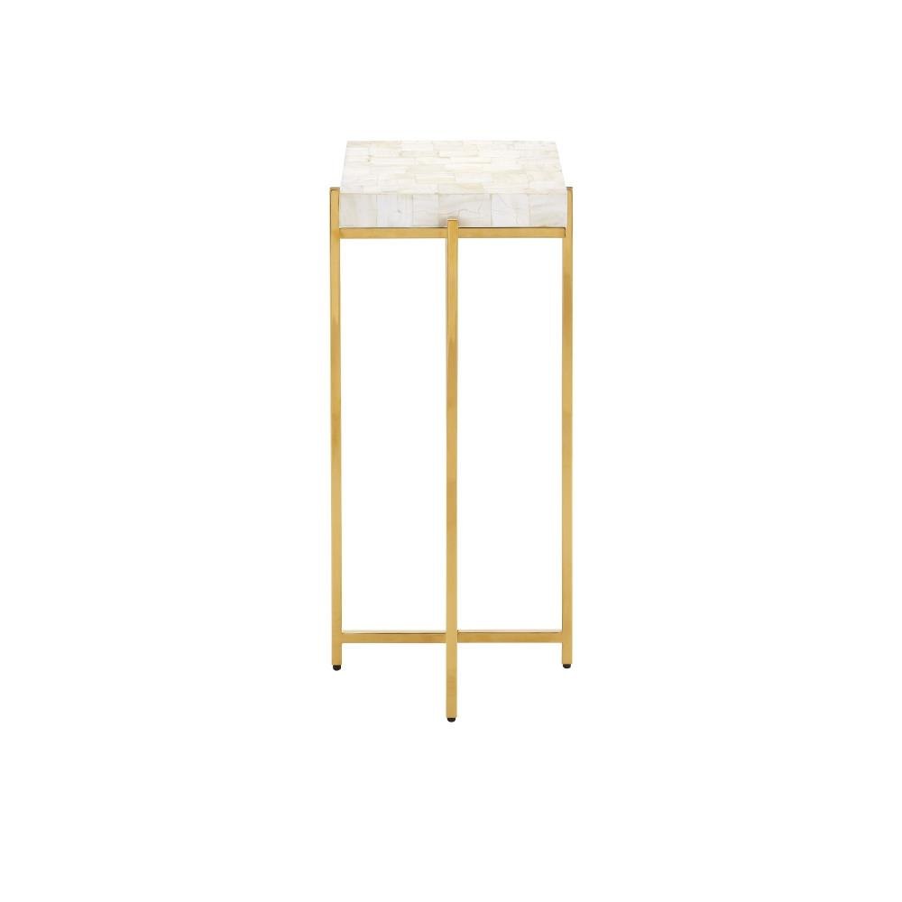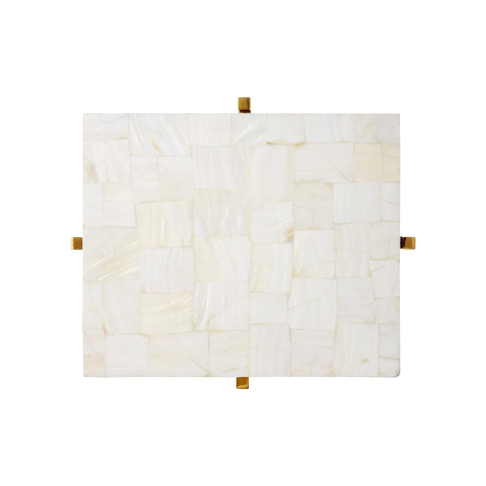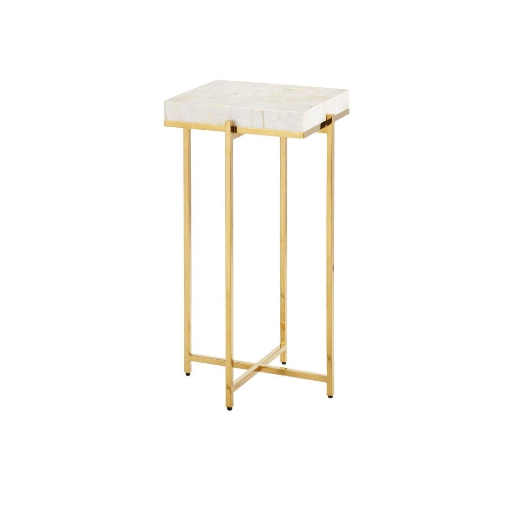 The luxe feel of a timeless material make the Casey Mother of Pearl Accent Table a striking display of fine artisanship. The top is covered in a mosaic of shells that were expertly placed to cover the rectangular slab, which is inset into the metal frame like a gem. Four legs made of stainless steel in a warm brass finish are connected by an ex-shaped stretcher. The gold and ivory drinks table will bring radiant charm to any spot even though it’s small.