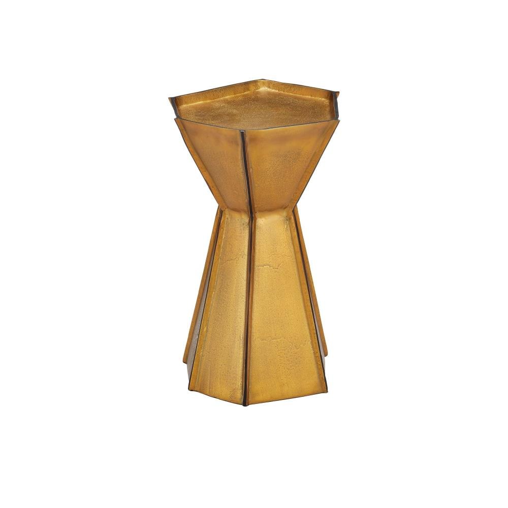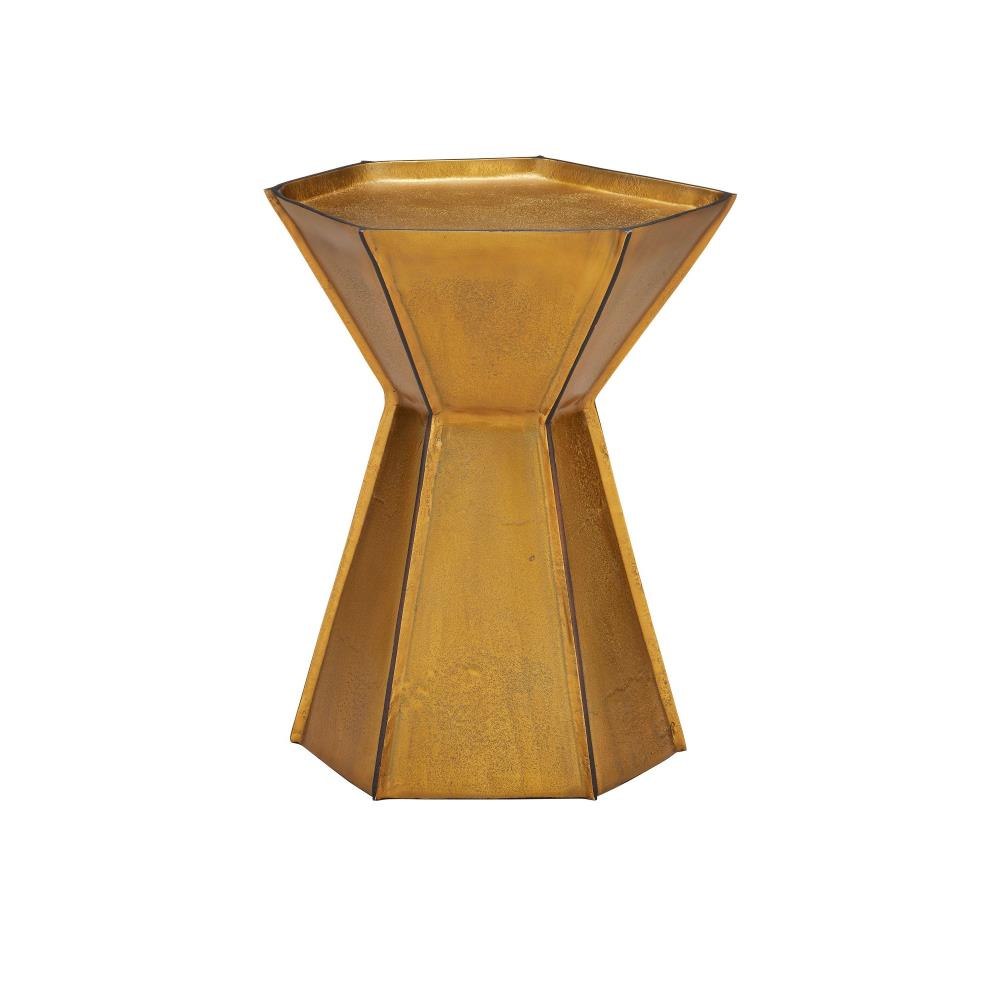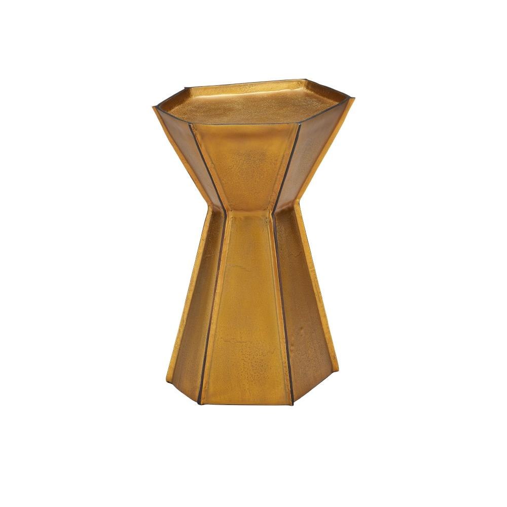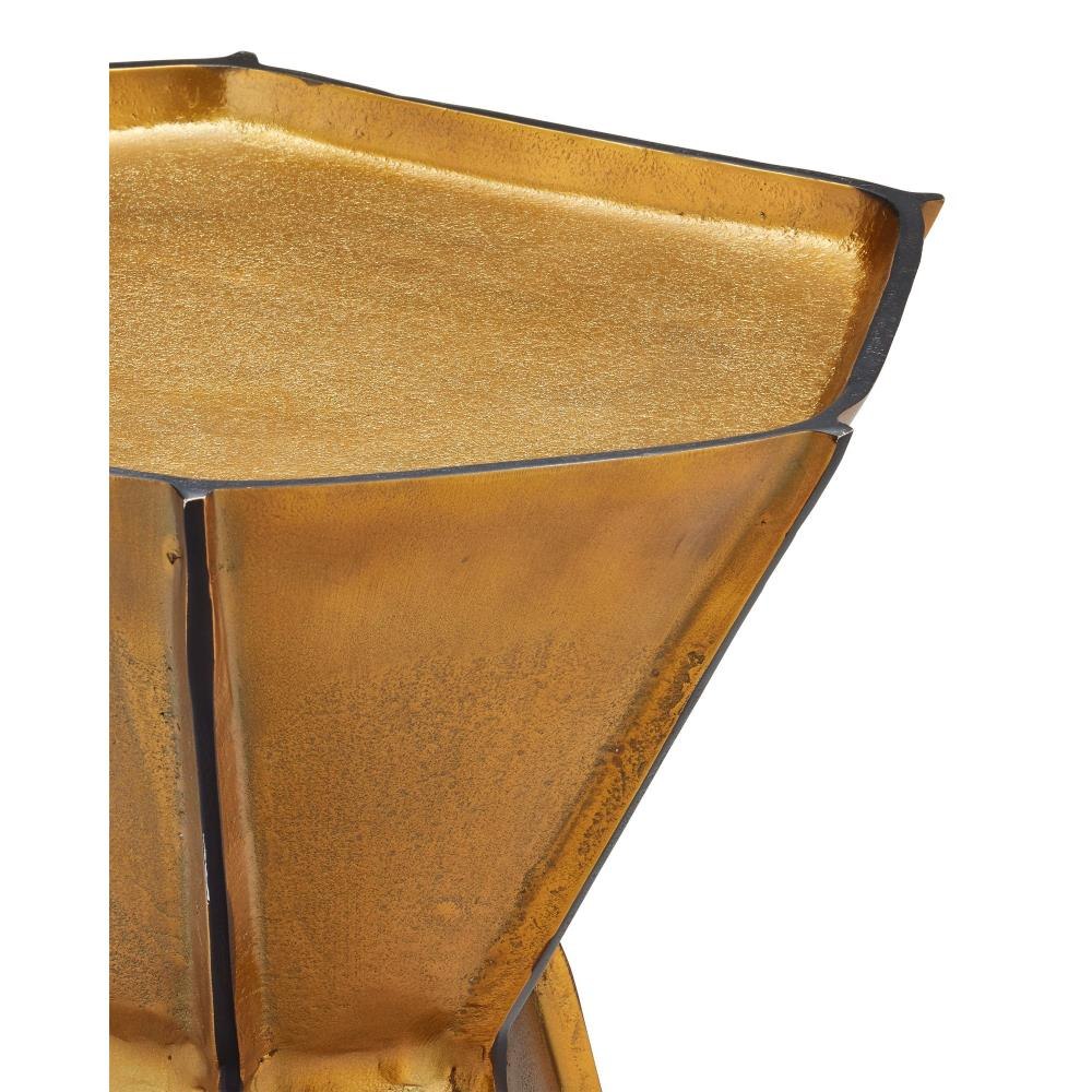 The Merola Gold Accent Table is crafted from cast aluminum in an antique brass finish. The asymmetrical table features raised lines in a contrasting bronze finish that slice through its angular planes. The irregular shape enhances its artistic appeal, making it perfect for layering metallic warmth into a room.
