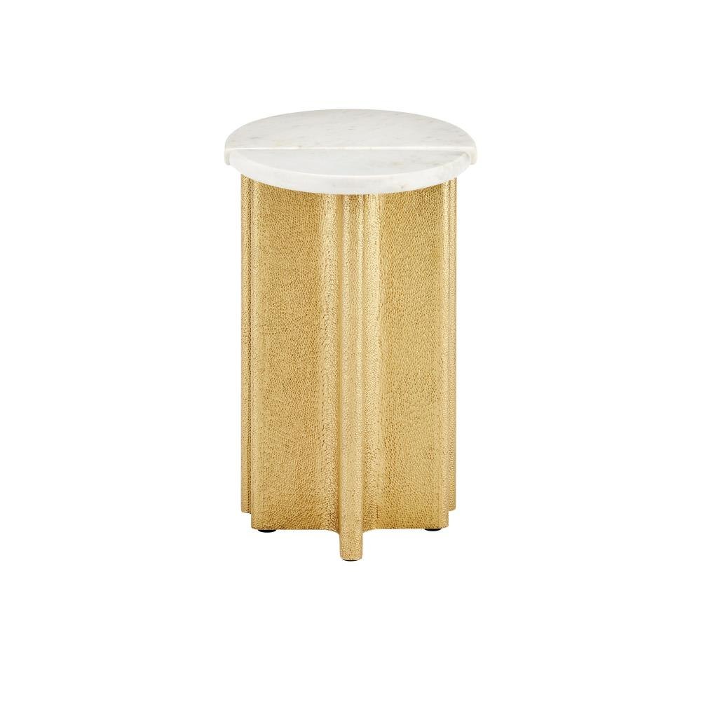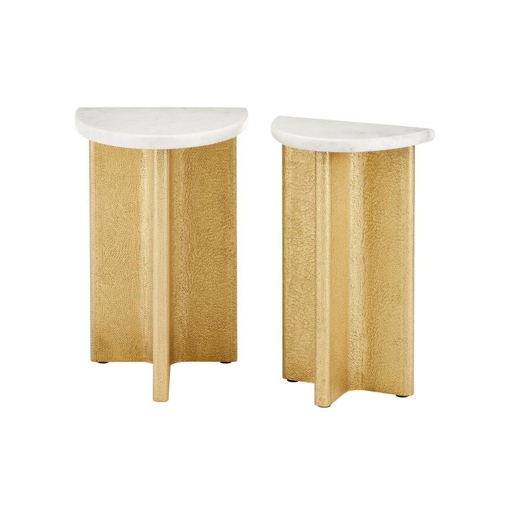 The Doublet Marble Accent Table Set includes two small tables that can stand alone as individual accents or be placed back-to-back to create a seamless oblong tabletop. The bases are adorned with hand-hammered brass sheeting in an intricate swirling pattern that evokes a serpentine elegance. Finished in antique brass, the textured bases are perfectly complemented by the cool contrast of the white Banswara marble tops.