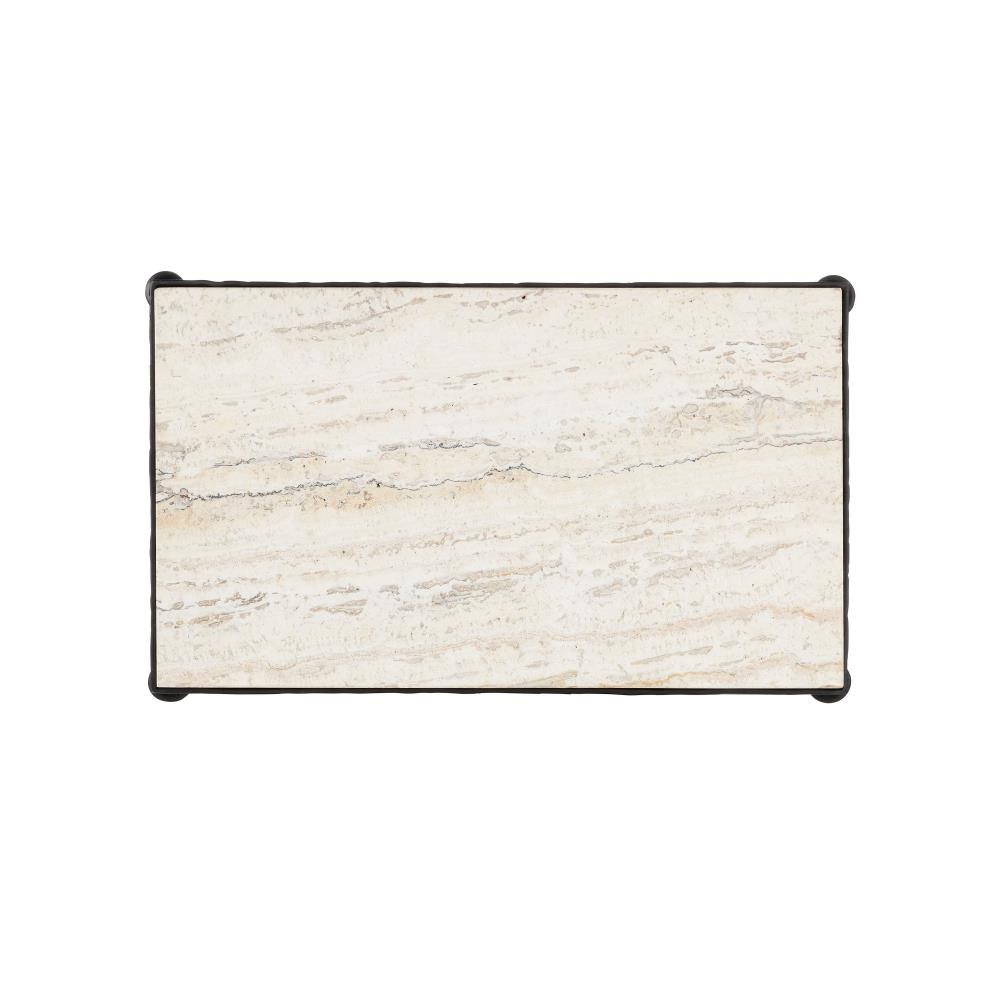 The Agora White Travertine Side Table blends classical Greek-inspired design with modern sophistication. Its white travertine top features dynamic veining that adds natural depth and texture. The looping hourglass-shaped legs, connected by a stretcher adorned with decorative orb detailing, create a striking sculptural silhouette. Finished in a rich bronze, the metal frame provides a warm contrast to the light stone.