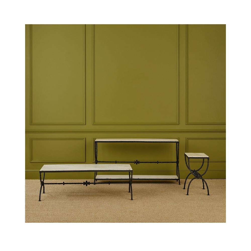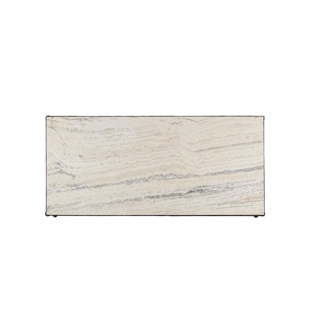 The Agora White Travertine Cocktail Table blends classical Greek-inspired design with modern sophistication. Its white travertine top features dynamic veining that adds natural depth and texture. The looping hourglass-shaped legs, connected by a stretcher adorned with decorative orb detailing, create a striking sculptural silhouette. Finished in a rich bronze, the metal frame provides a warm contrast to the light stone.