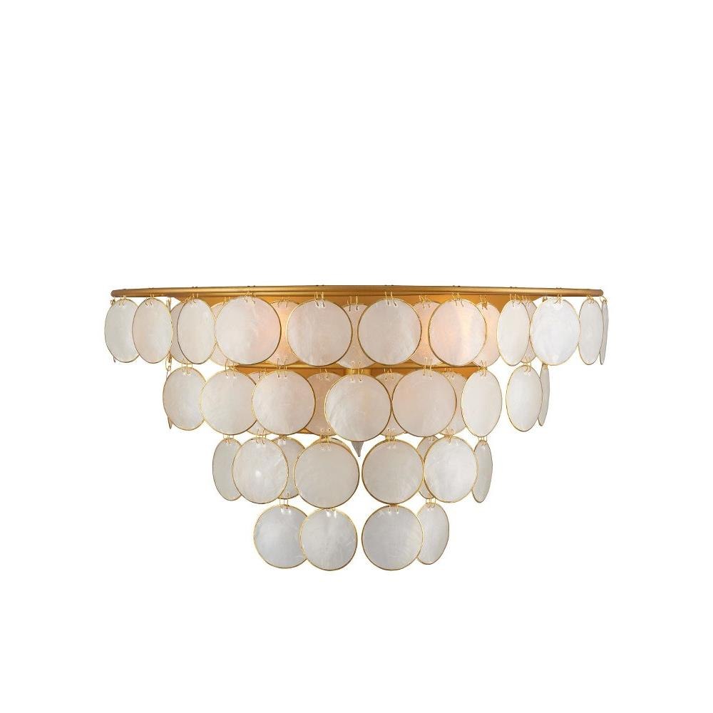 Ethereal in its vibe, the Bon Vivant Sconce was designed by Tom Caldwell. The discs that effervesce with illumination are made of Capiz shells ringed in a decorative metal edge that matches the gold finish on the rest of the fixture. The delicate scale of the wires that fasten the discs to the frame and to each other is a sophisticated design detail. This gold and white wall sconce is a mid-century-modern inspired design.
