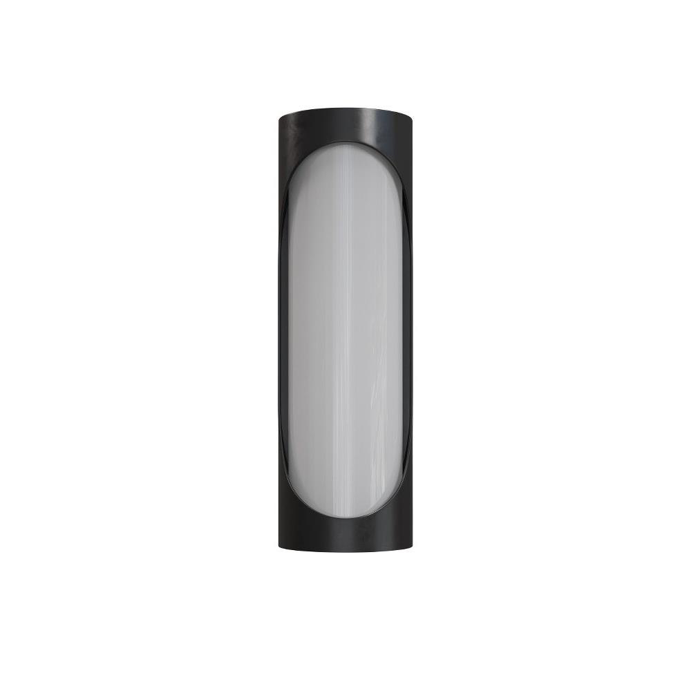 The Swale Large Outdoor Wall Sconce has a graphic silhouette with cut outs where illumination can escape. The front of the black sconce is covered with a milky white glass that illuminates uniformly when the integrated LEDs shine through it. The metal is powdercoated to make this outdoor sconce weather worthy.
