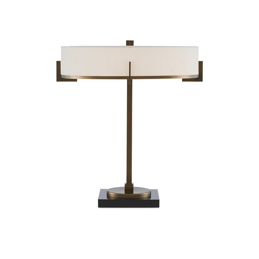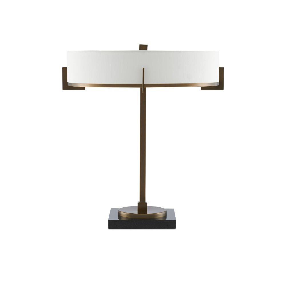 Design notes of our Jacobi Table Lamp include the thin stem rising from a black marble base that is similar in width to the finial, the sleek off-white shantung shade, and how the shade is clasped by geometric accents. This gold lamp is made of metal in a brushed brass finish.
