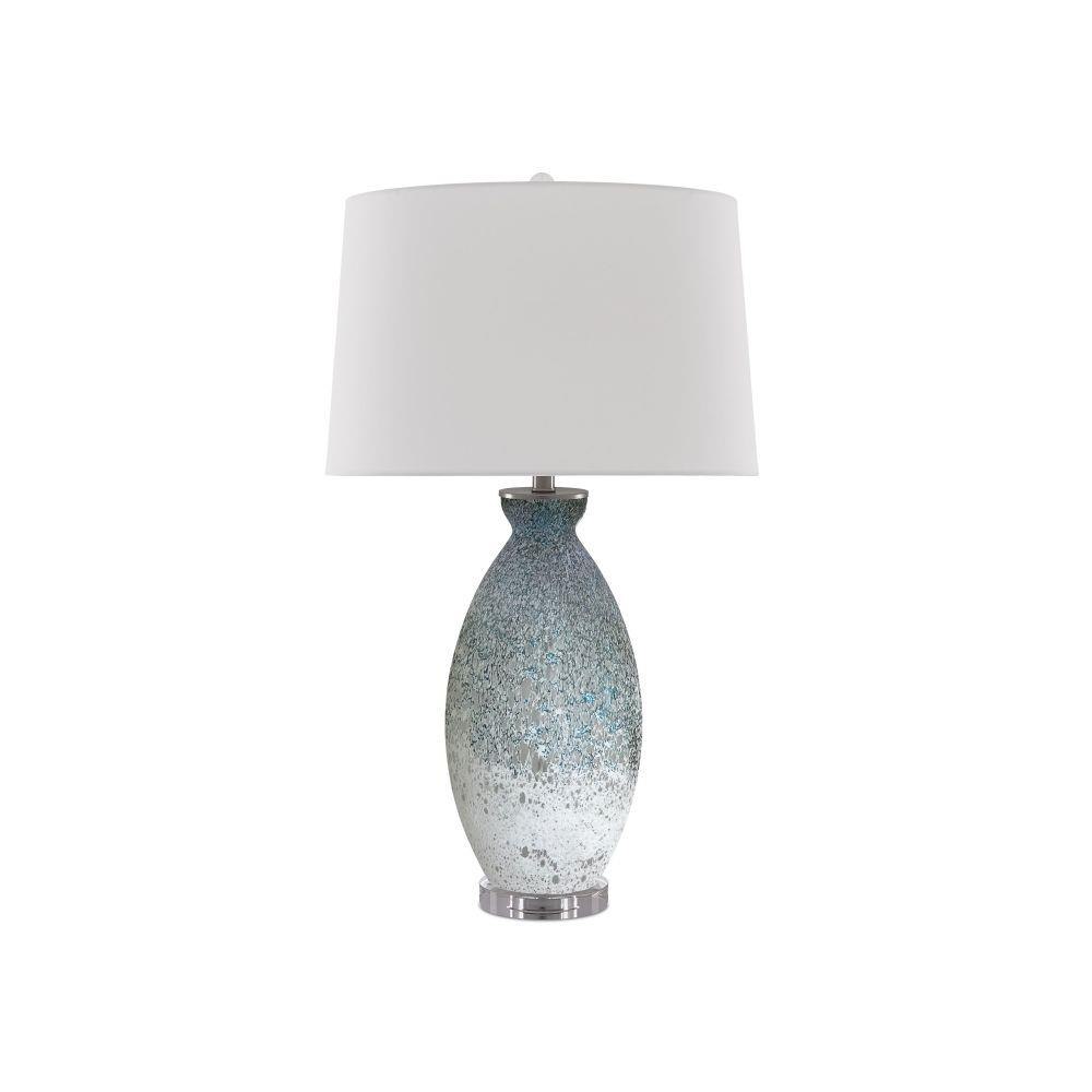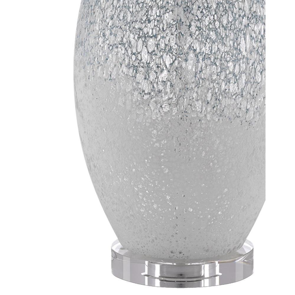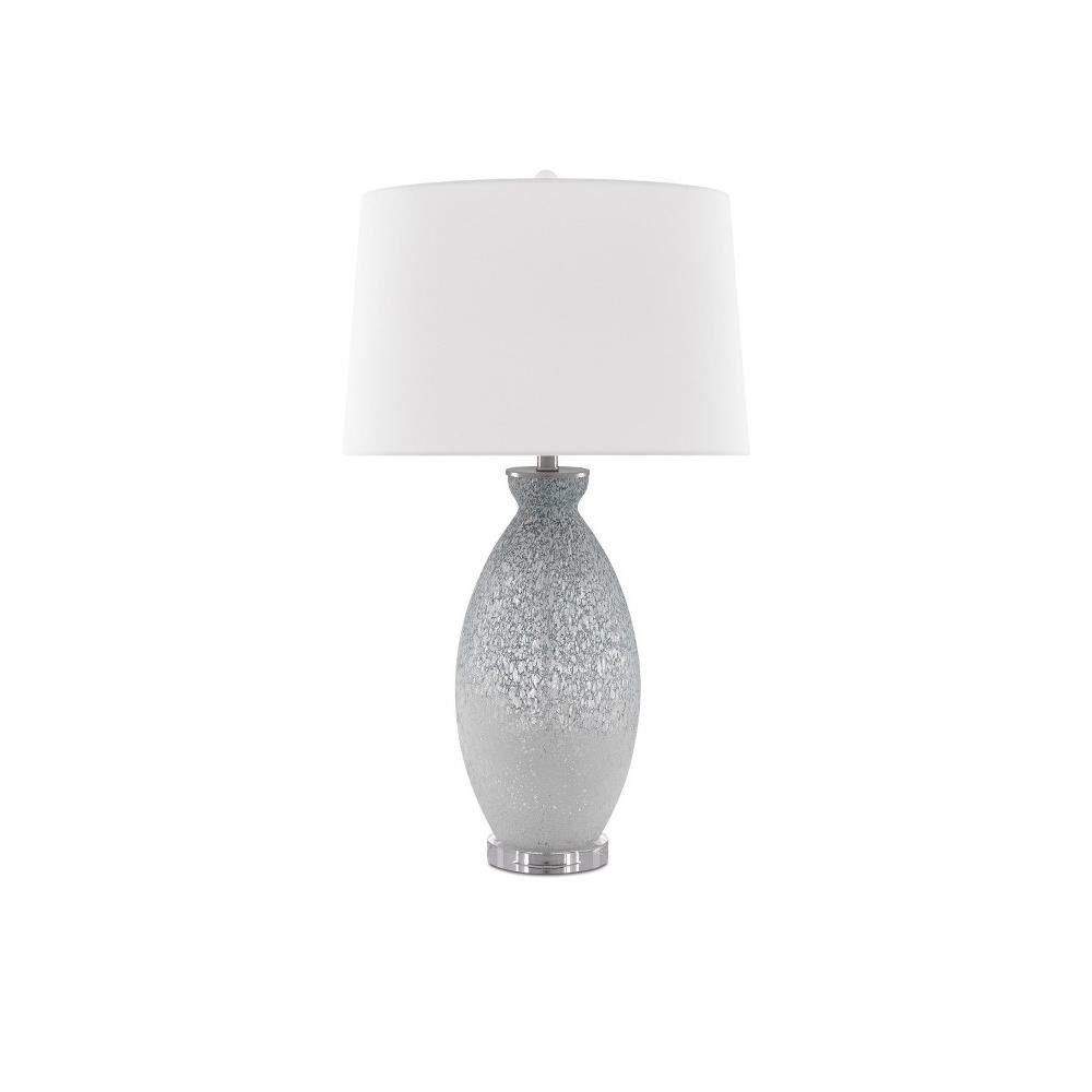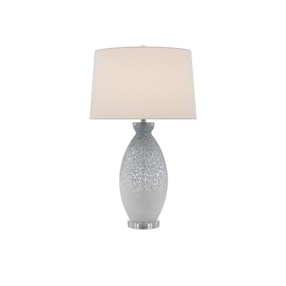 Like the moon rising out of fog, the body of our Hatira Table Lamp has a mysterious patterning on the clear glass body hand-applied in pale blue and white. We placed the pale blue lamp on an optical crystal base and topped it with an oversized off-white linen drum shade.
