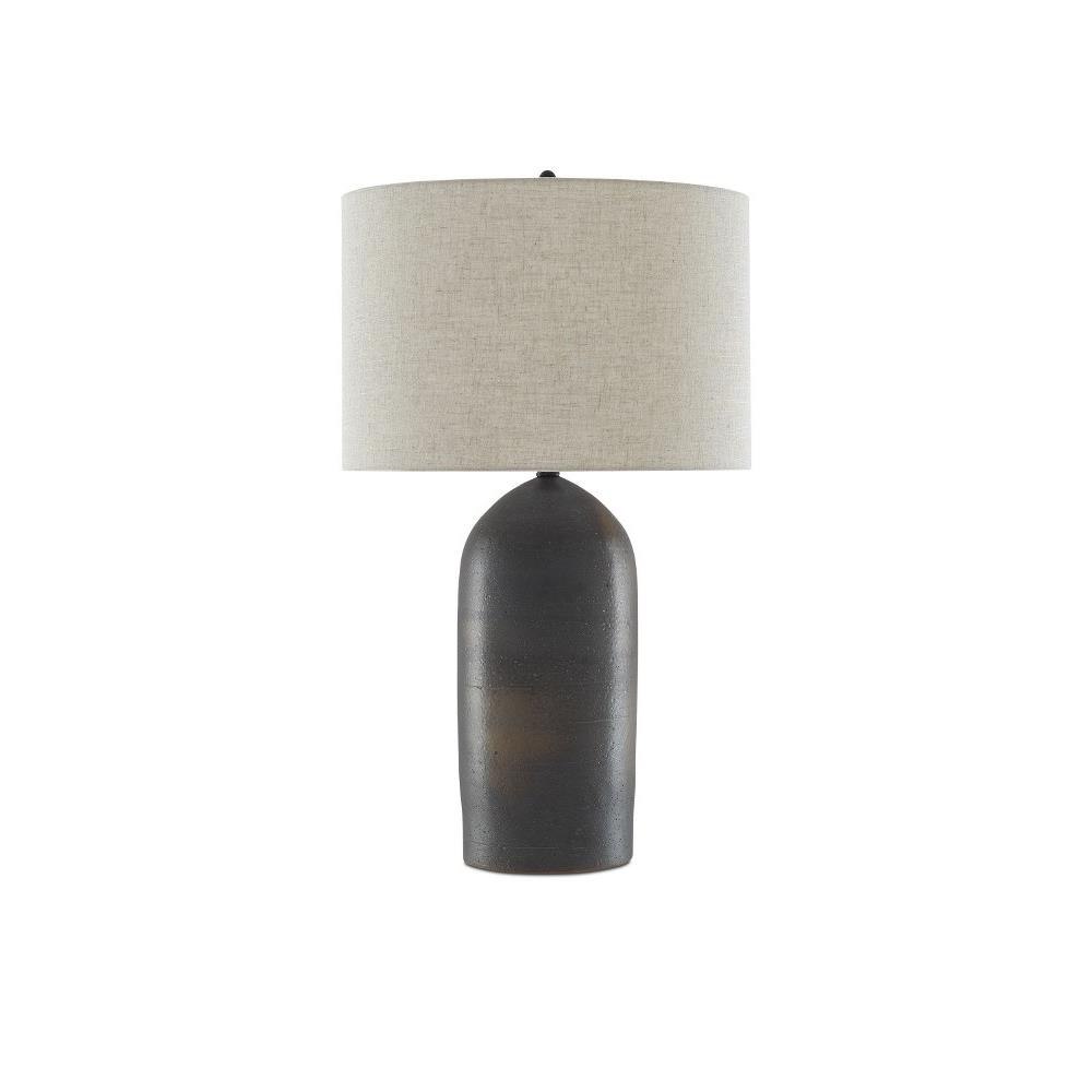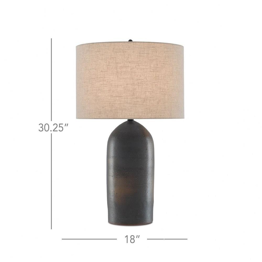 The torpedo-shaped body of the Munby Table Lamp has subtle variations in texture. Made of rust-colored and iron-hued ceramic, dark gray tones dominate on the lamp's body with rust patches showing through. Metal hardware in a semi-glossy black finish and a matching finial secure the natural linen shade to the gray lamp.